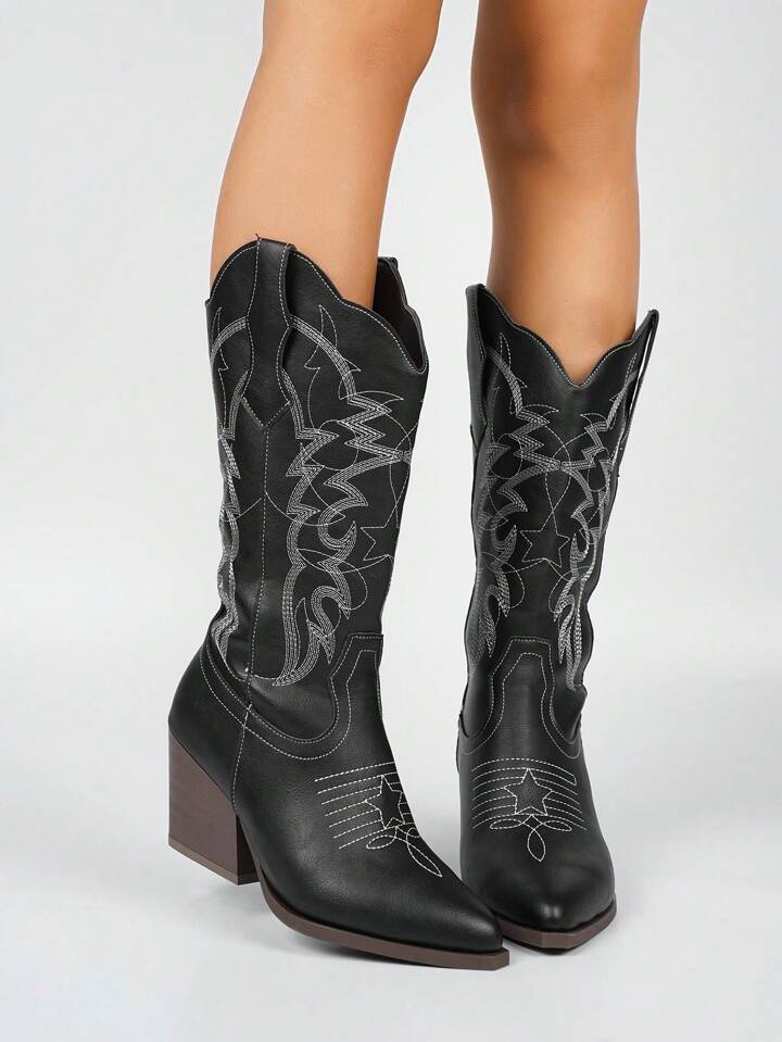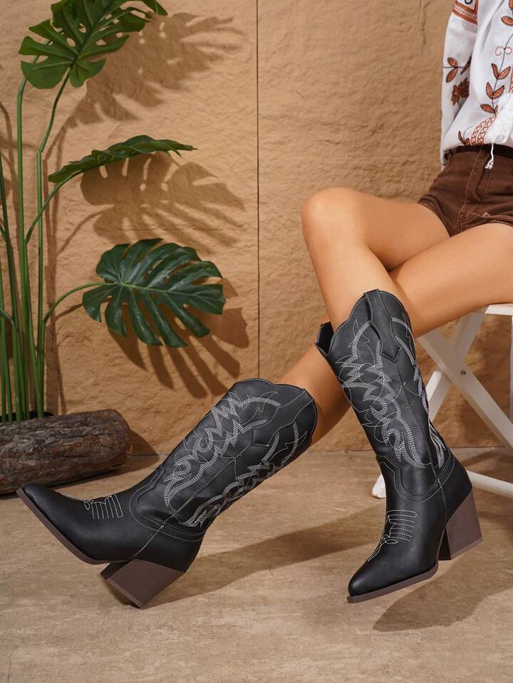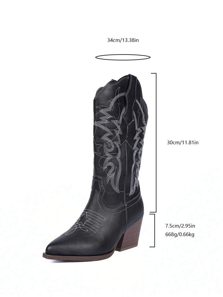Fairycore Botas de vaquera bordadas para mujer, tacón grueso retro europeo y americano de punta redonda y media pantorrilla, tallas grandes