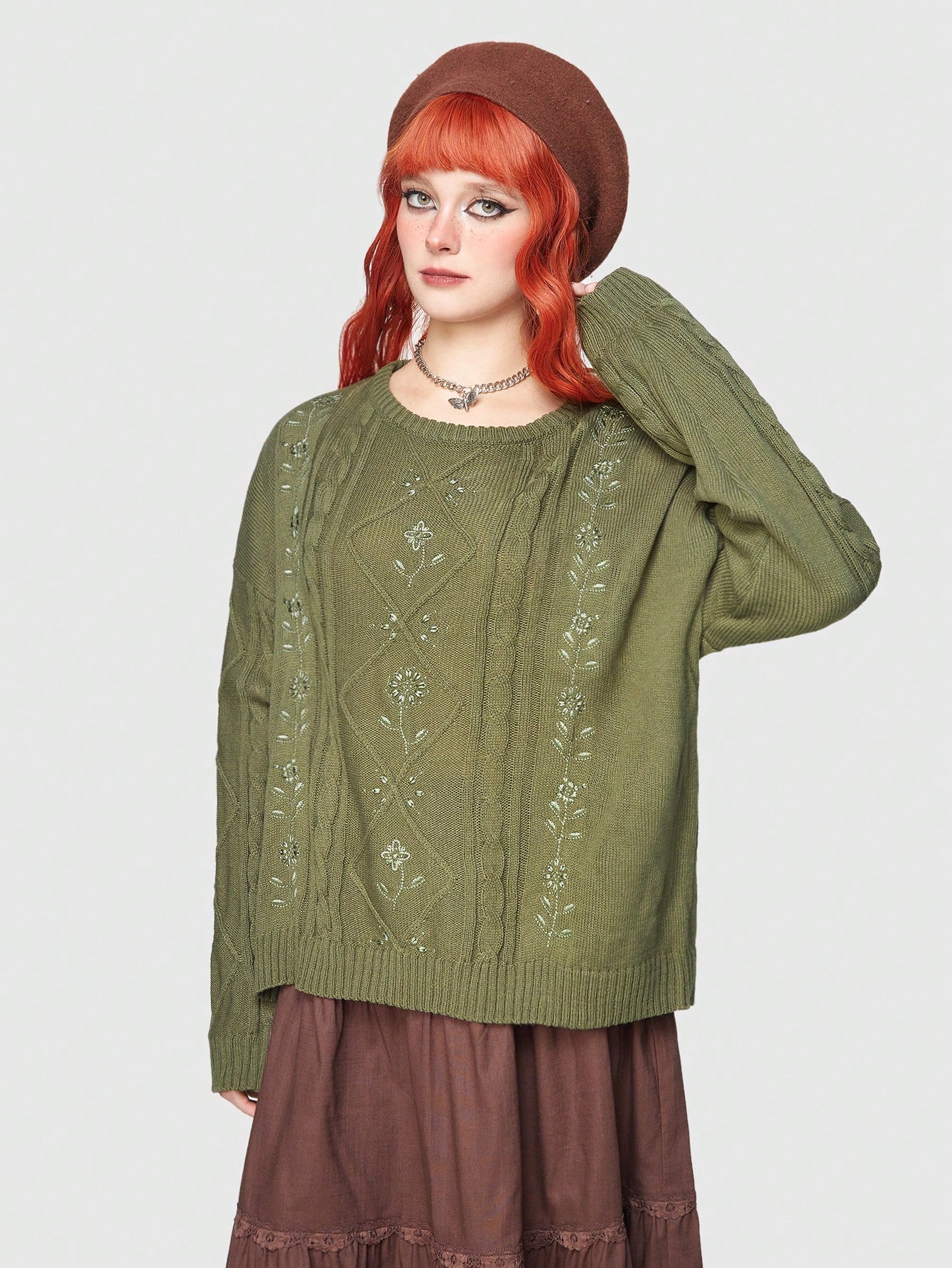 Fairycore Suéter De Hombro Caído Para Mujeres Con Bordado Floral