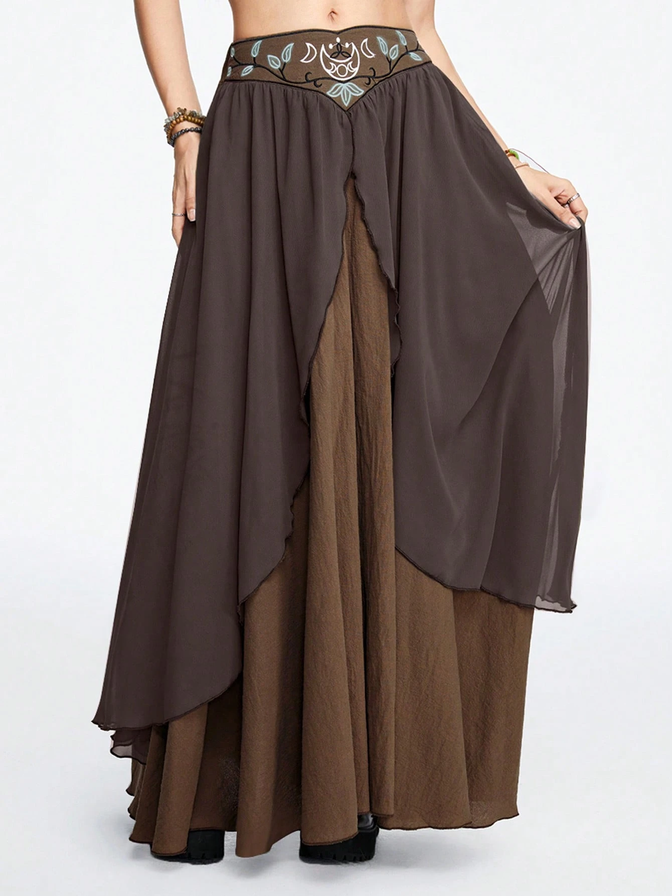 Fairycore Falda larga con estampado floral y contraste de malla para mujer