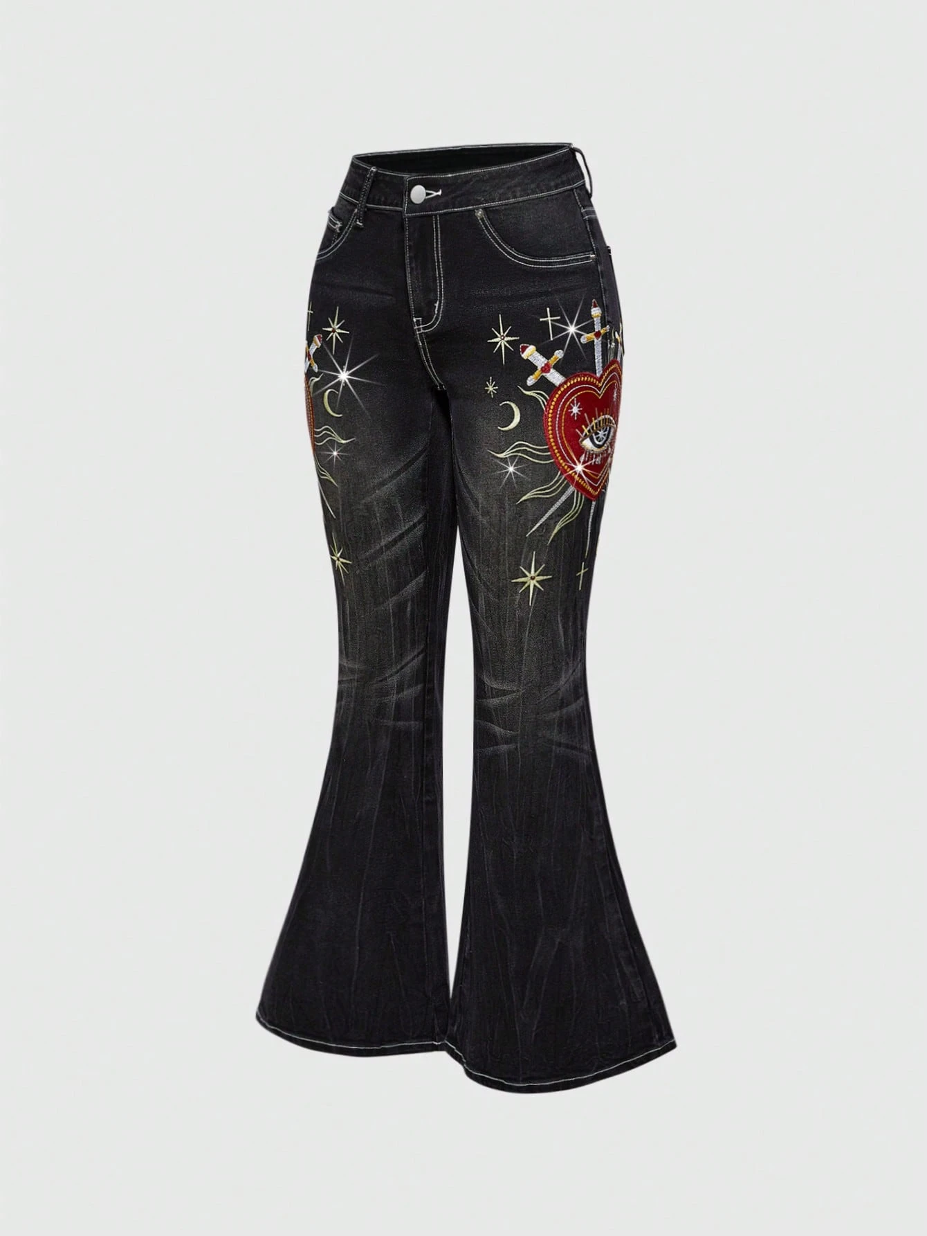Fairycore Pantalones retro de mujer con detalles bordados de ojos en forma de corazón, letras, rhinestones y detalles de jean