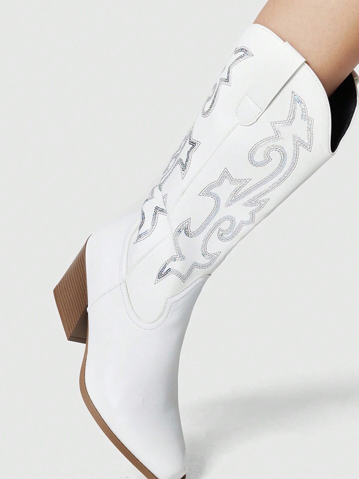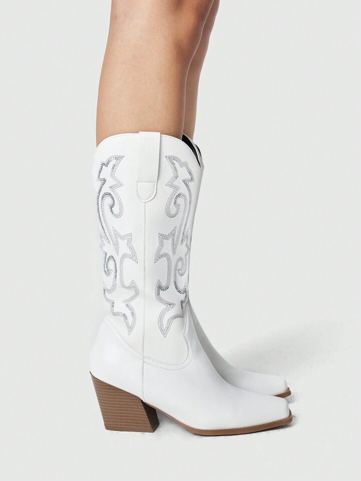 Fairycore Botas de tacón alto con punta cuadrada para mujer, con detalles bordados y cremallera lateral. Botas de piel de media pantorrilla de moda para primavera/otoño