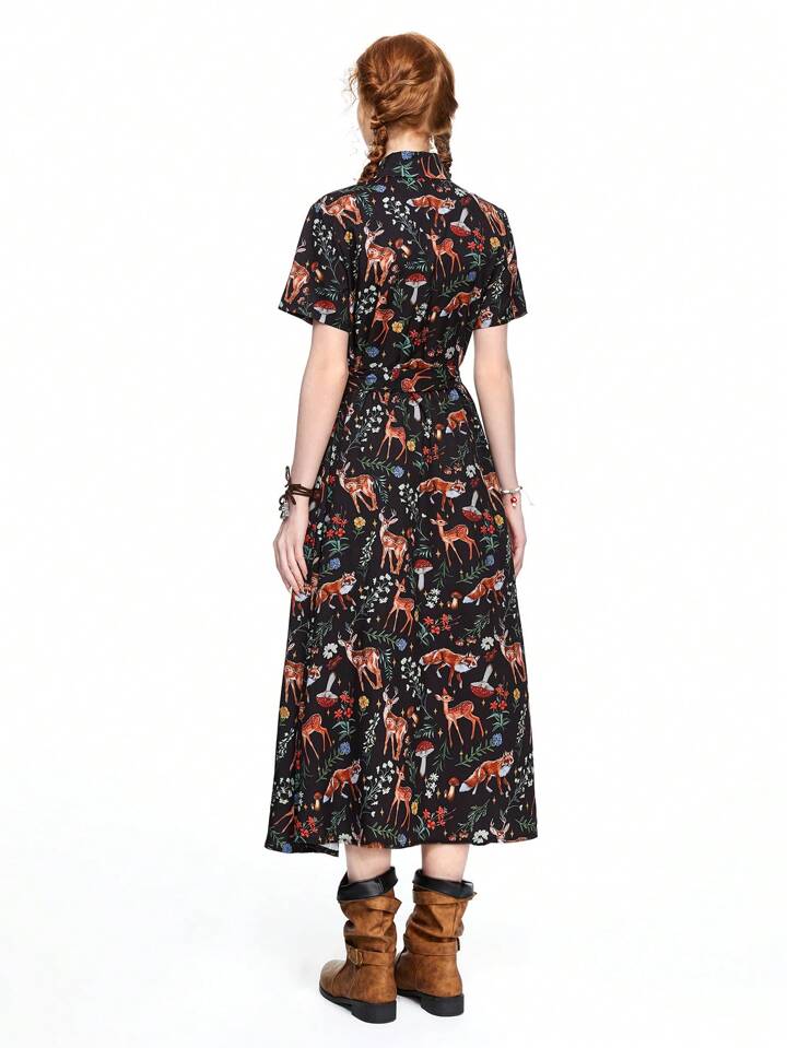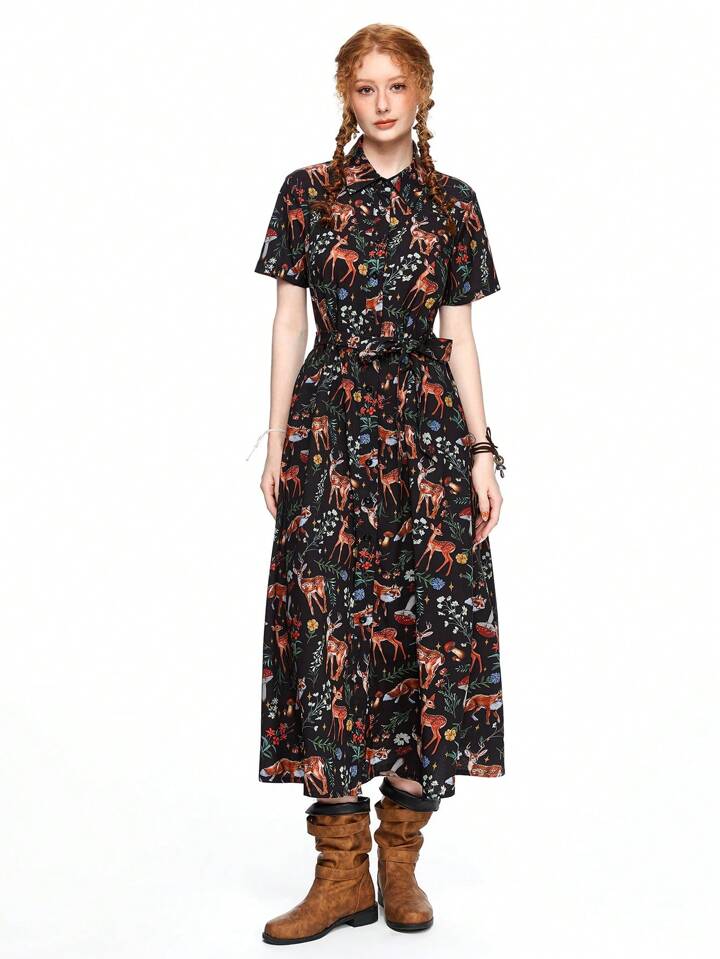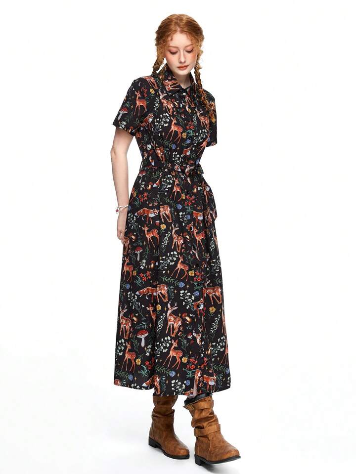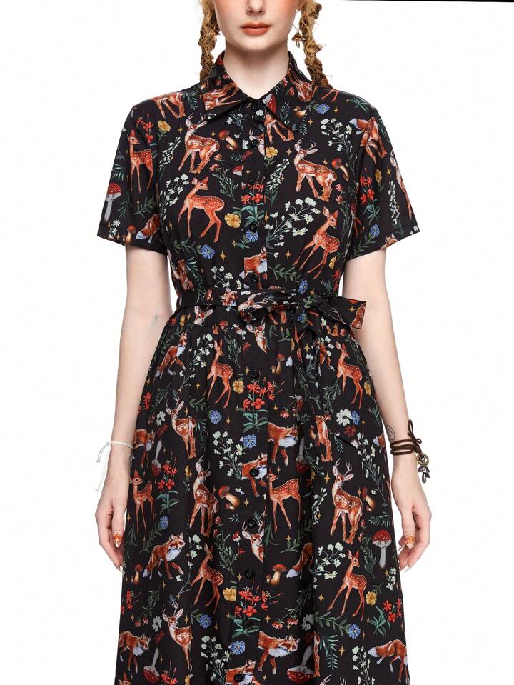 Fairycore Vestido camisa con cinturón de estilo de vacaciones con estampado floral y animal para mujer
