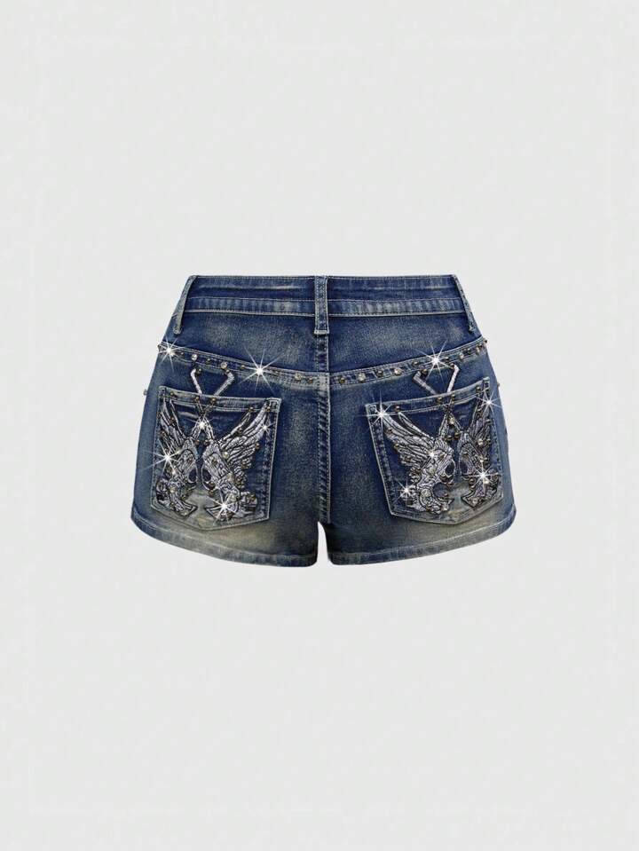 Fairycore Shorts vaqueros de tiro bajo para mujer con bordado de alas de pistola, estilo cowgirl del año 2000, para festivales