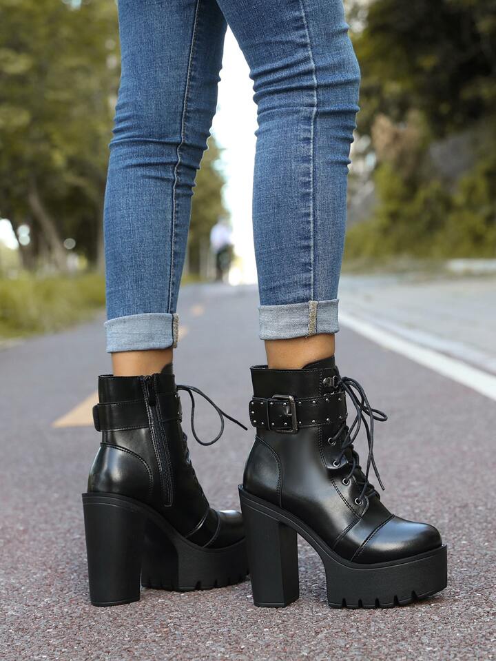 Botas con cordones, tachuelas y hebillas decorativas para mujer, de estilo punk con puntera redonda y plataforma, para looks de fiesta en otoño/invierno