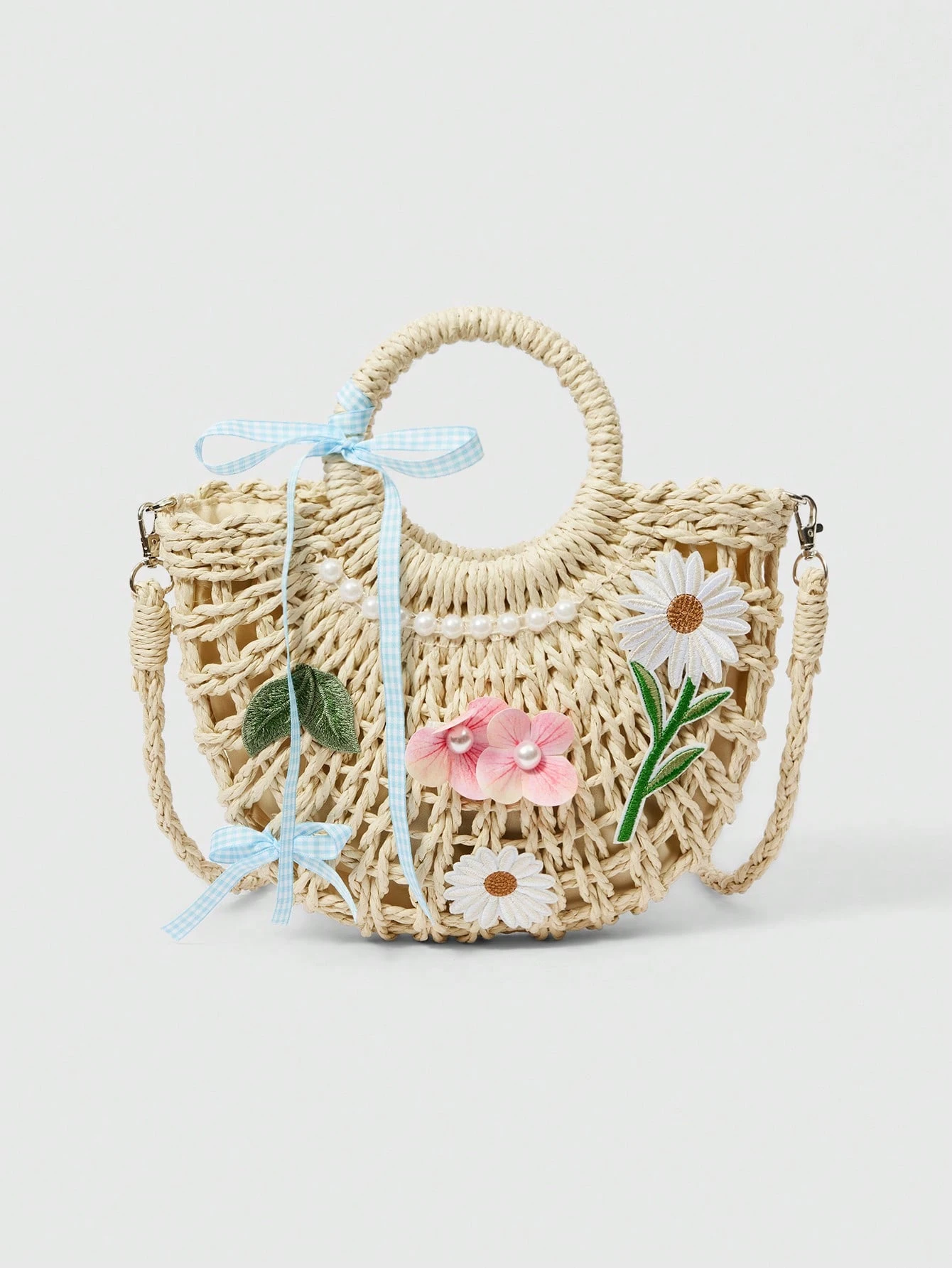 Bolso de paja portátil con perlas huecas y decoración de moda, pasador de flor para el cabello con clip DIY