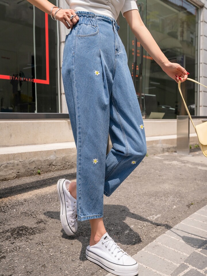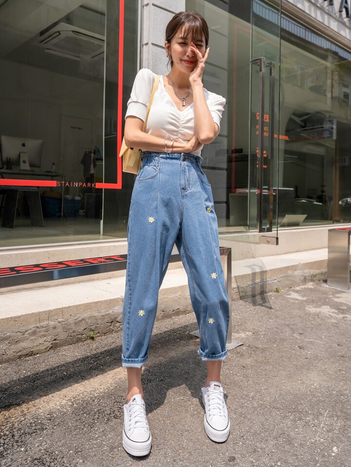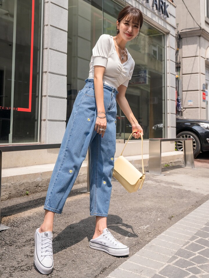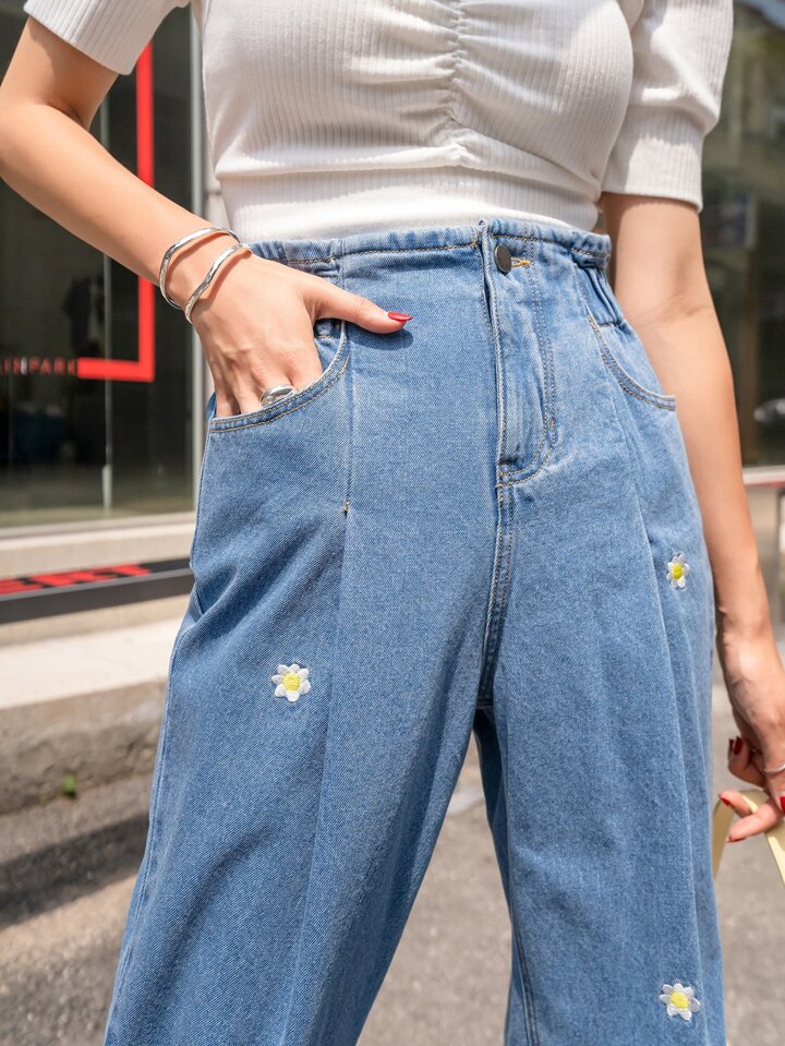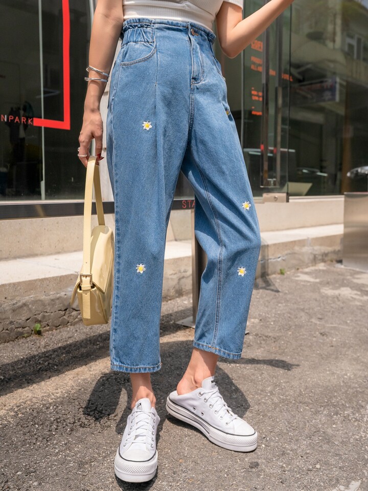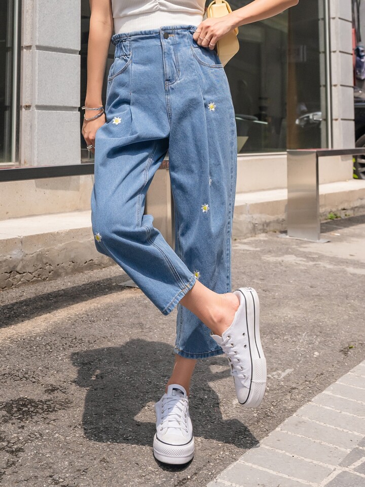 Jeans Cortados Ajustados De Estilo Mamá Con Bordado Floral