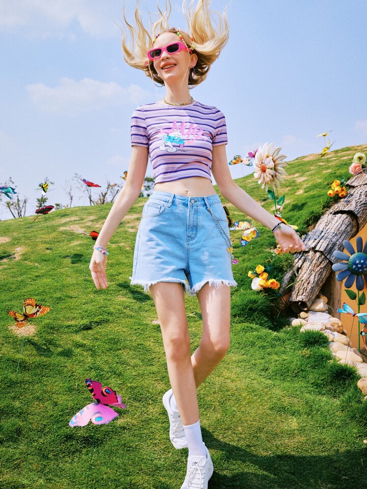 Shorts en mezclilla con bordado floral bajo crudo