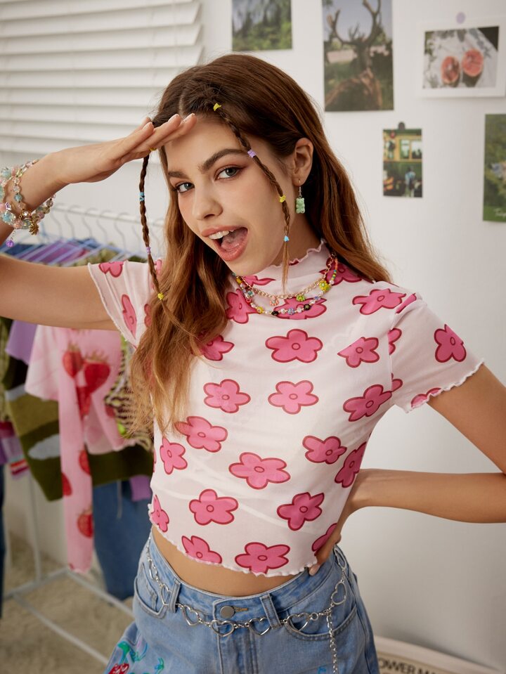 Camiseta corta con estampado floral ribete en forma de lechuga sin sujetador