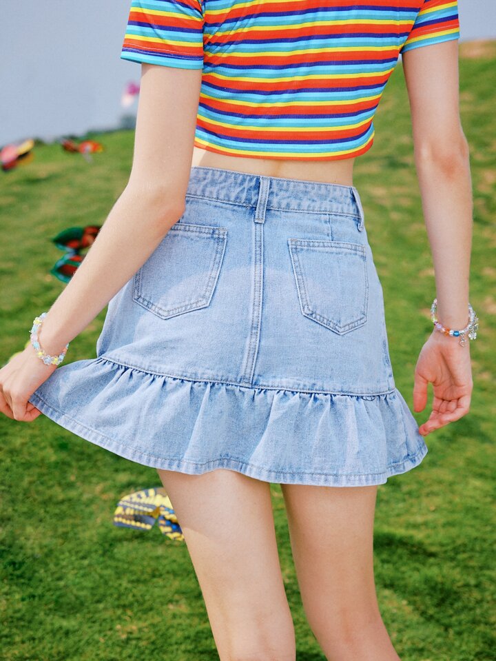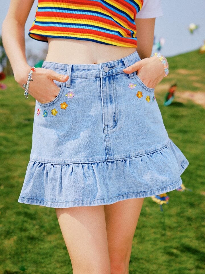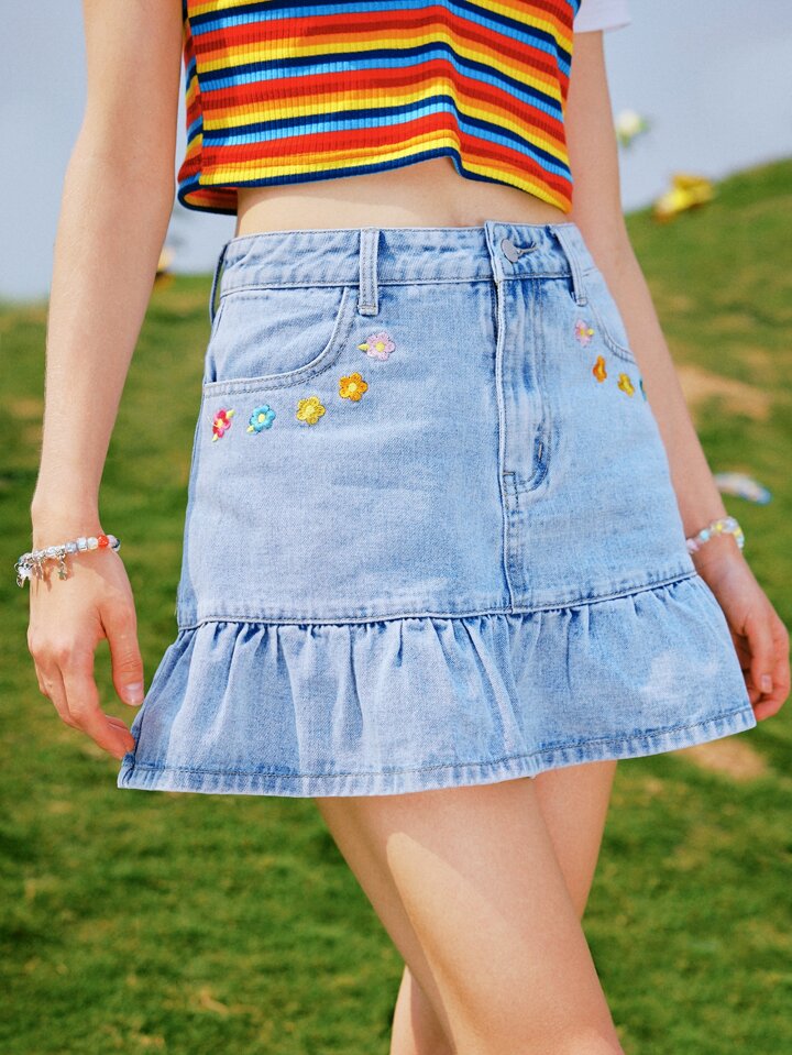 Falda en mezclilla floral bajo con fruncido