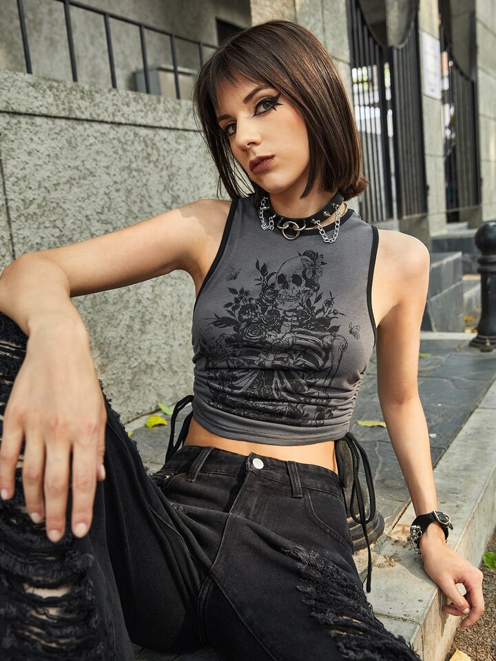 Top tank floral & estampado de cráneo con cordón fruncido unido en contraste