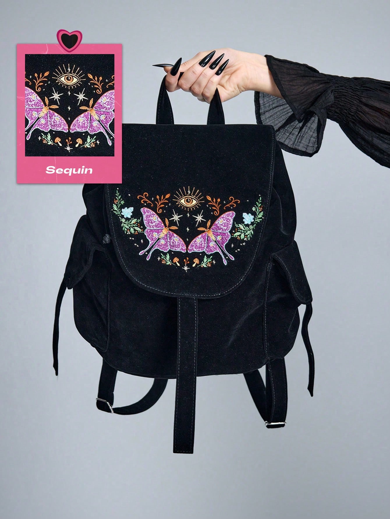 Tipo de flor: 1689137 Hilo de bordado de alta calidad Mochila con estampado de sol, estrella, luna, polilla, seta y planta, mochila gótica oscura