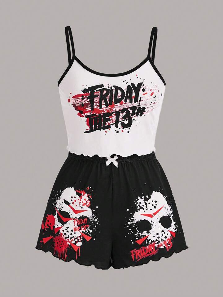 Friday the 13th X ROMWE Pijama con gráfico de calavera de letras, con borde de lechuga, para la escuela