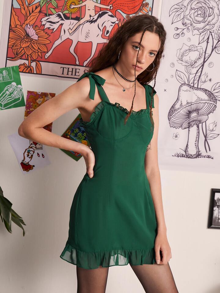 Vestido de tirantes ribete fruncido de hombros con cordón