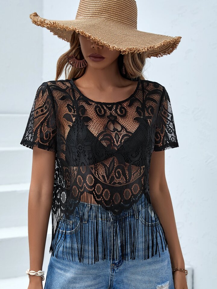 Top de pareos bajo con fleco transparente con encaje sin sujetador