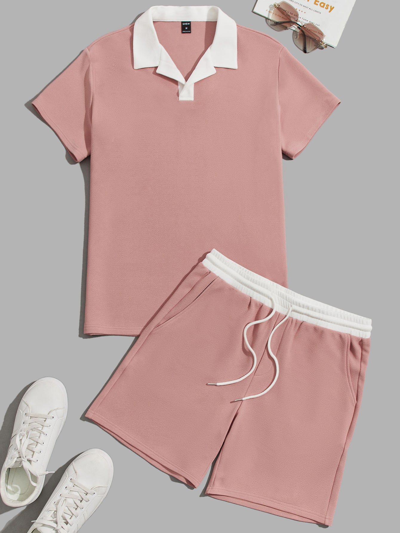 GENTILAND Hombres Camiseta de cuello en contraste & Shorts deportivos de cintura con cordón