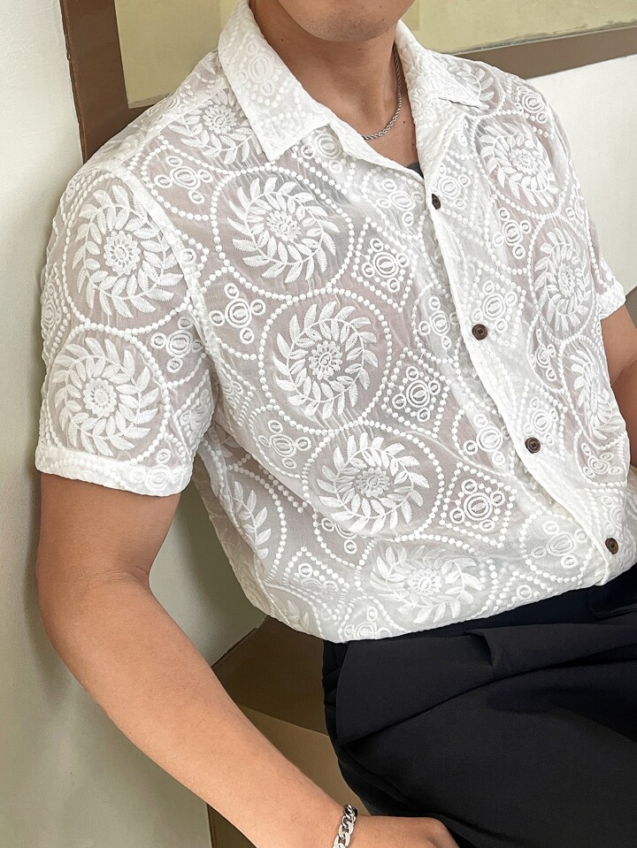 GENTILAND Camisa blanca para salir de hombre en corte amplio con bordado floral, con cuello de solapa, manga corta y cierre de botones todo en blanco
