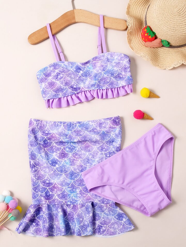 Niñas 3 piezas Conjunto de cola de sirena con volantes y estampado de escamas de pescado