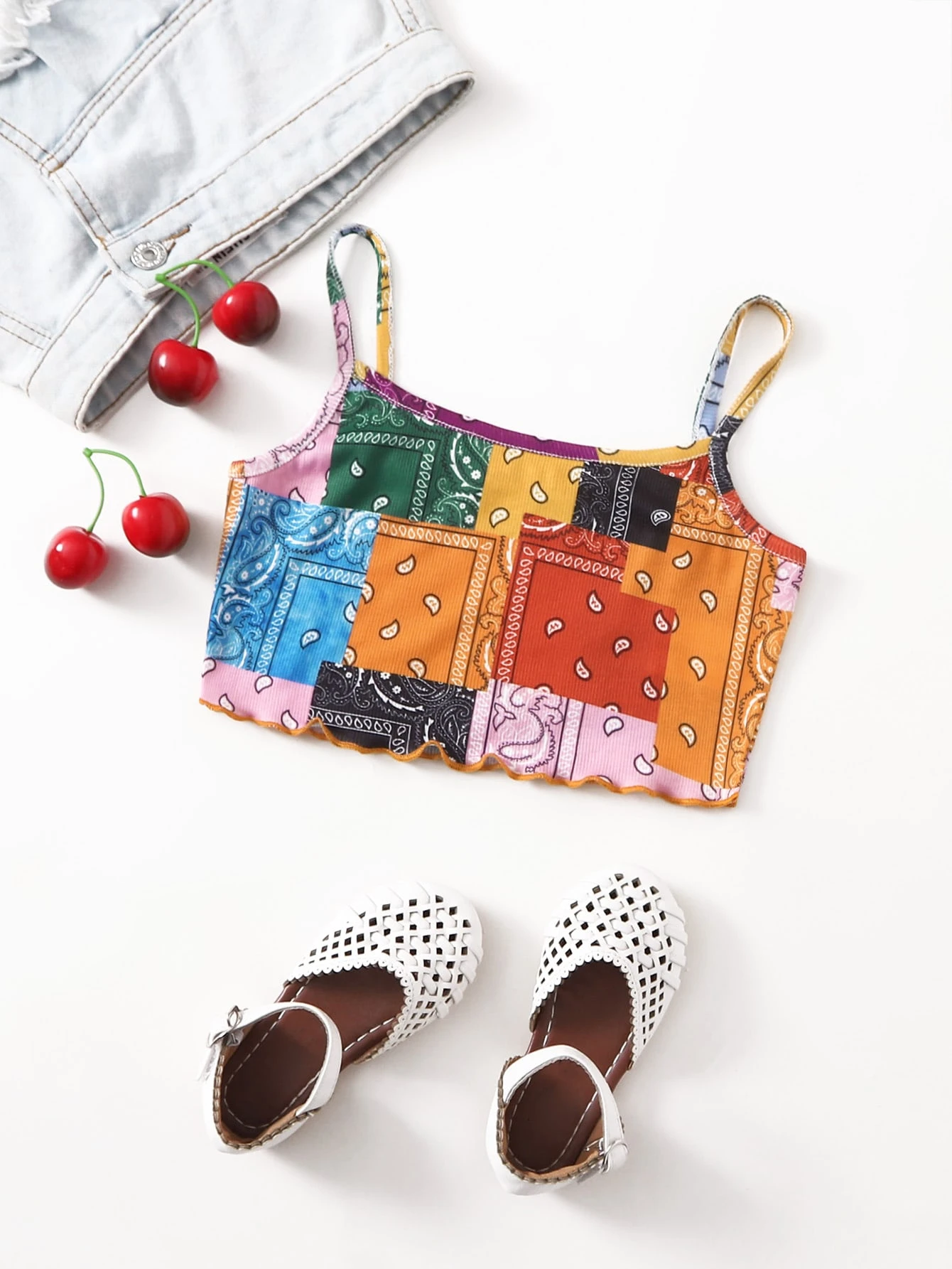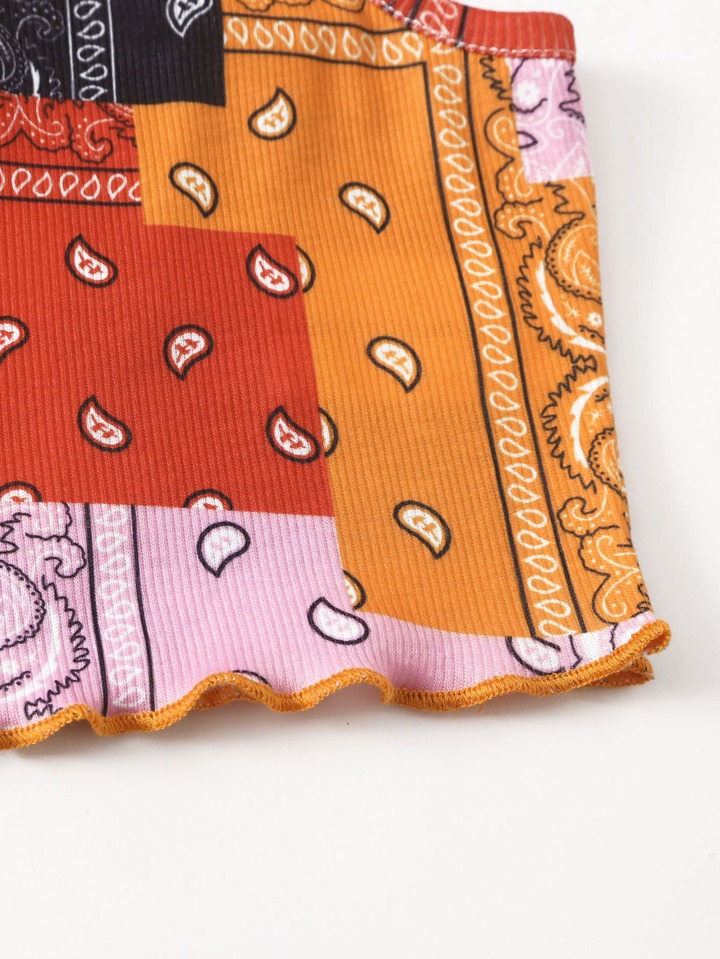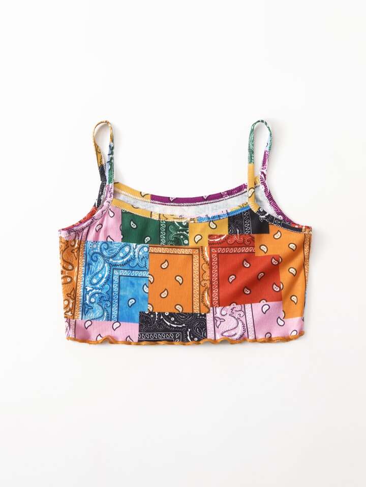 Top de tirantes ribete en forma de lechuga con estampado de retazo
