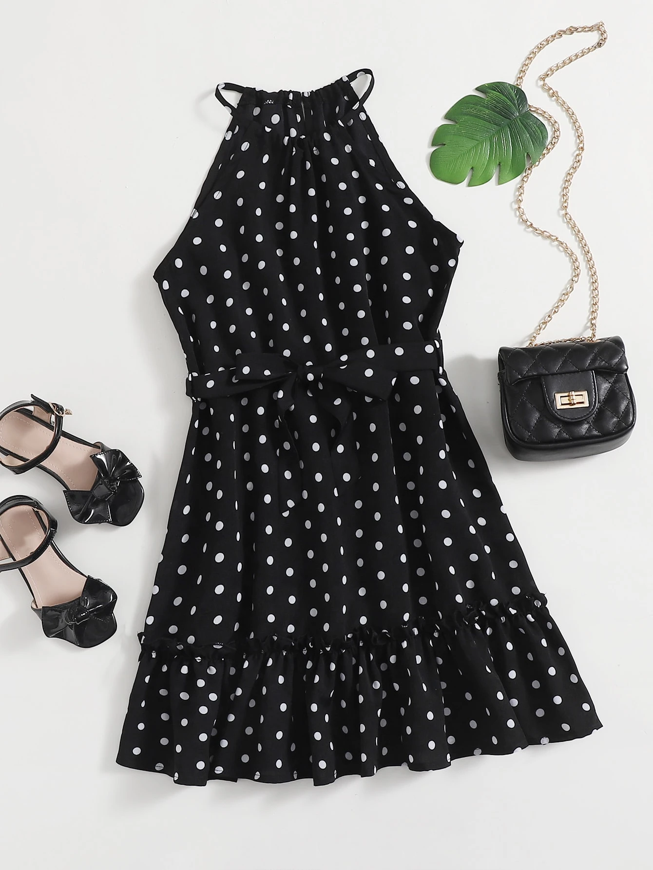 Vestido Con Cinturón Y Detalles De Volantes Y Lunares Para Niñas