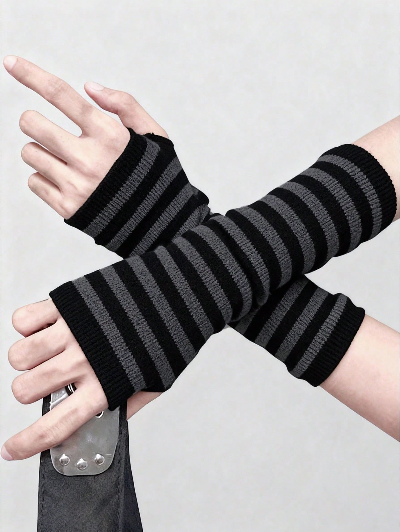 Goth 1 par de guantes de estilo minimalista tejidos, cubierta de brazo a rayas en blanco y gris de estilo pastoril.