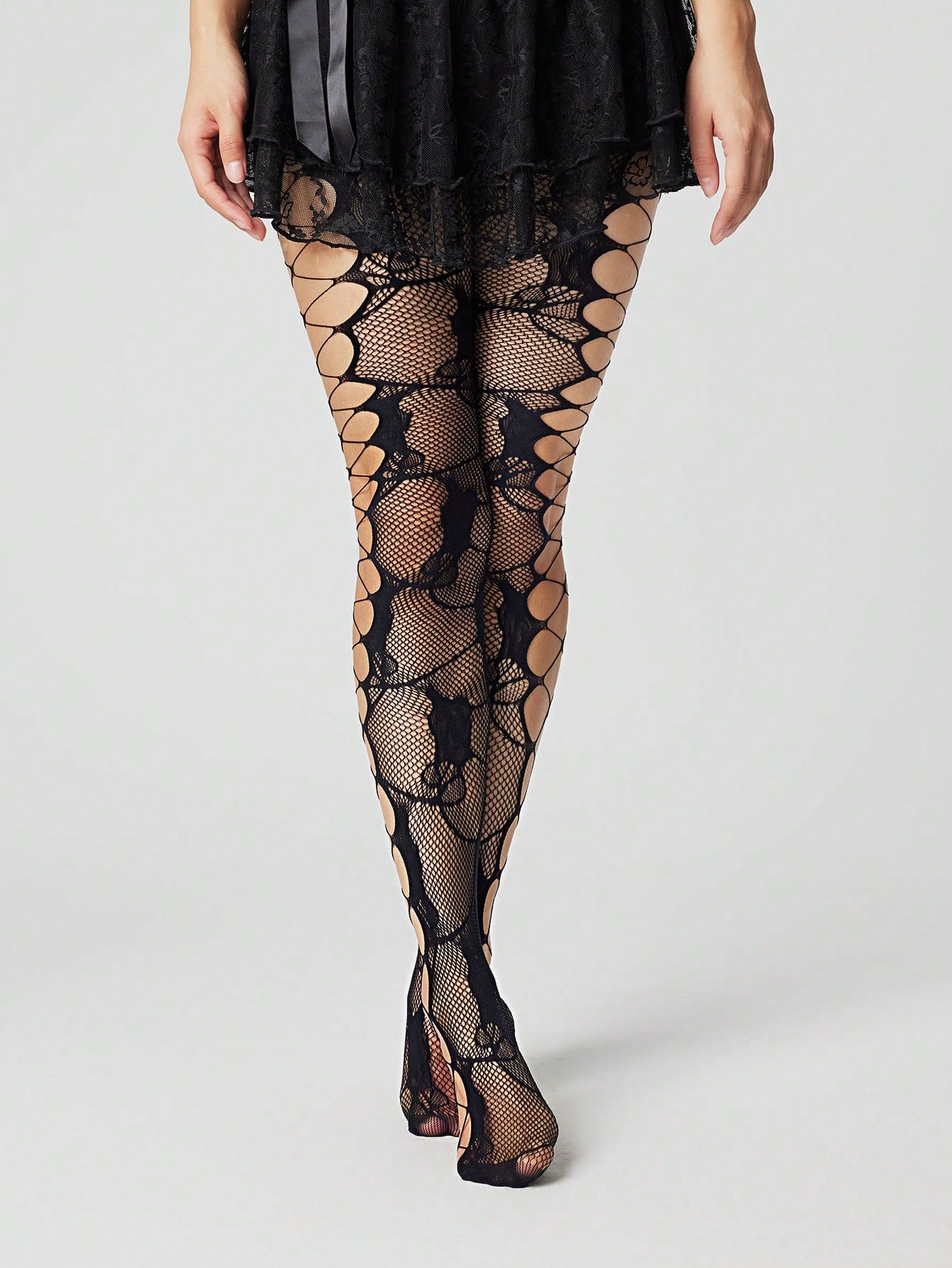 Goth 1 par de medias de red cruzada negra con diseño floral hueco del Museo de Muñecas
