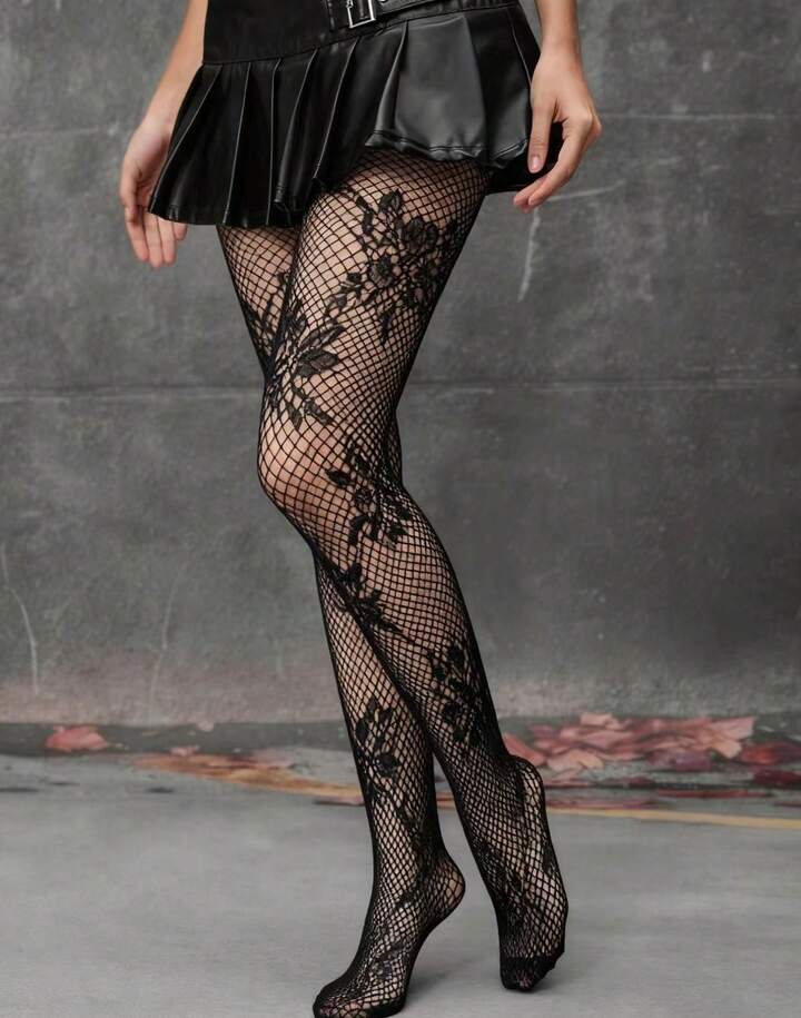Goth 1 par de medias/pantimedia de rejilla floral blanca