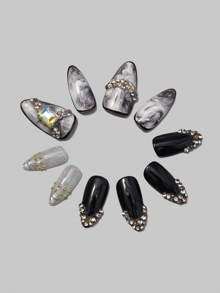 Goth 10 piezas largo almendra con diseño de diamante de imitación Uña postiza Kit