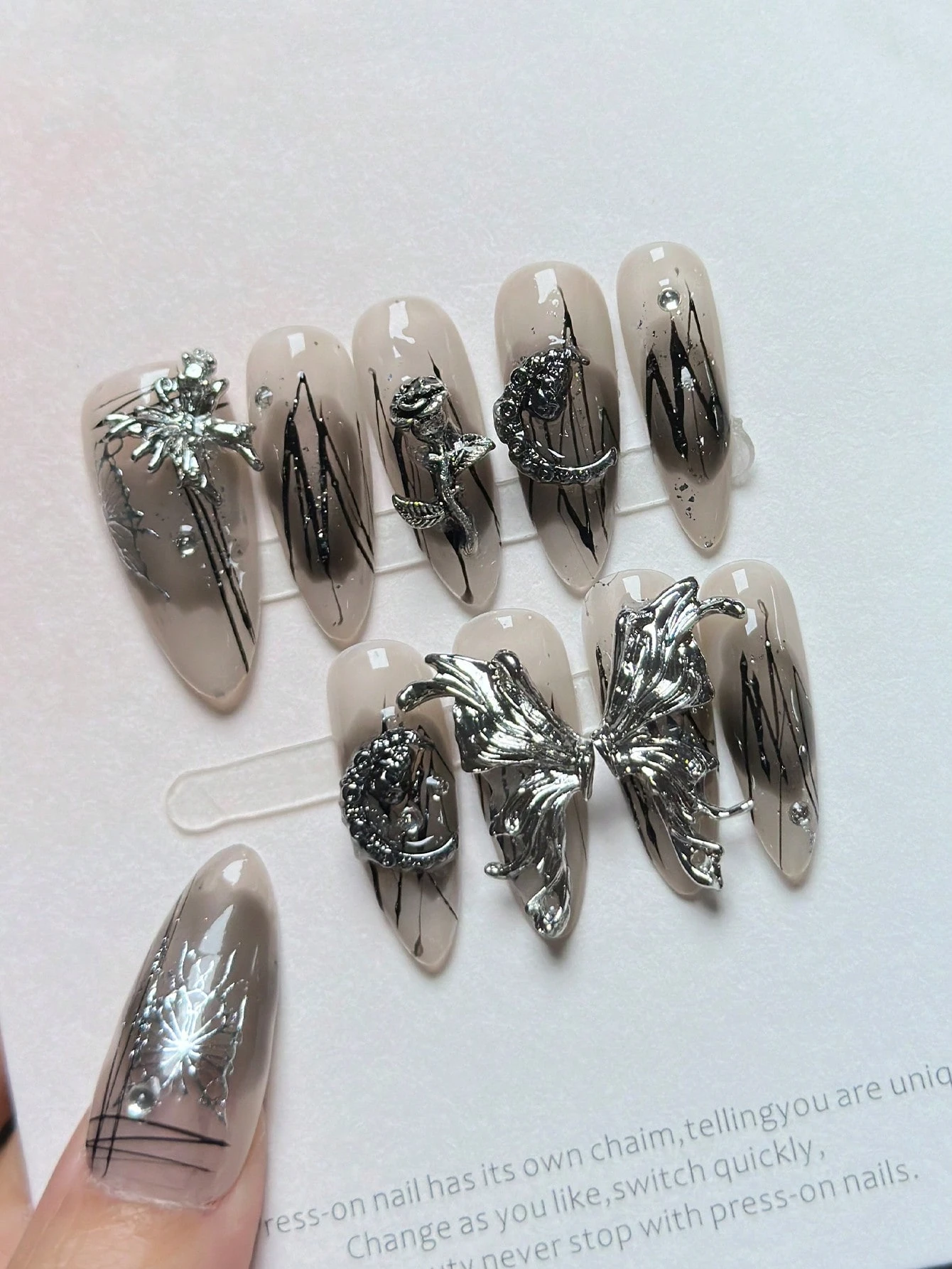 Goth 10 Piezas Uñas Postizas Con Diseños De Mariposas Y Rosas Pintadas En Metal Con 1 Hoja De Cinta Adhesiva De Doble Cara
