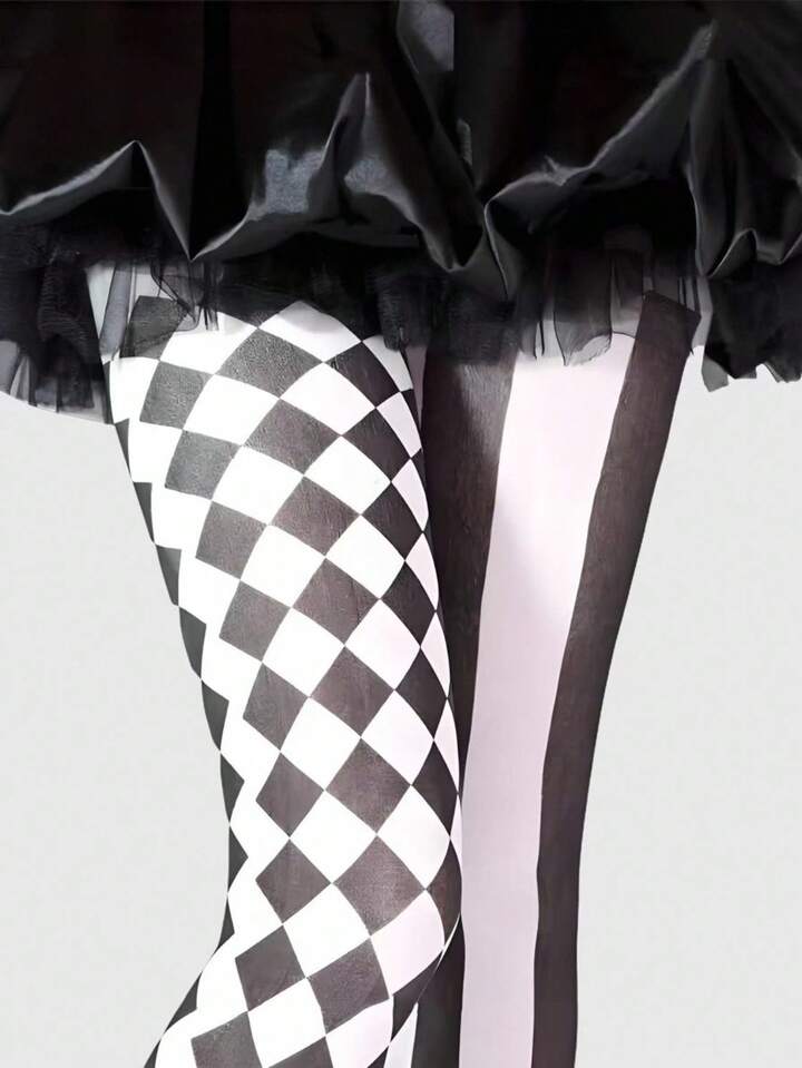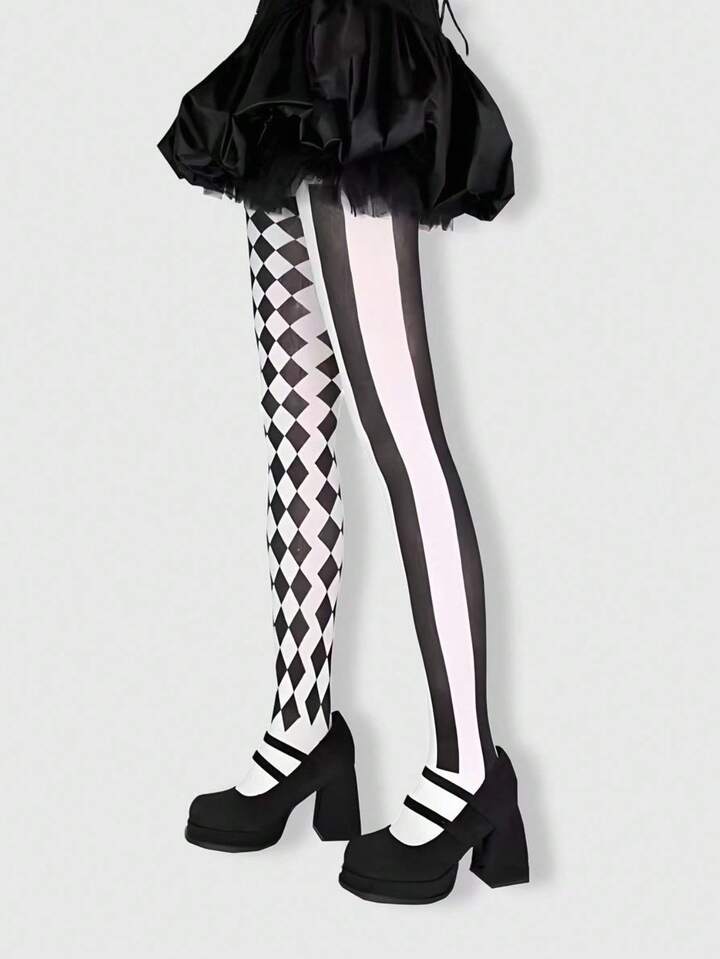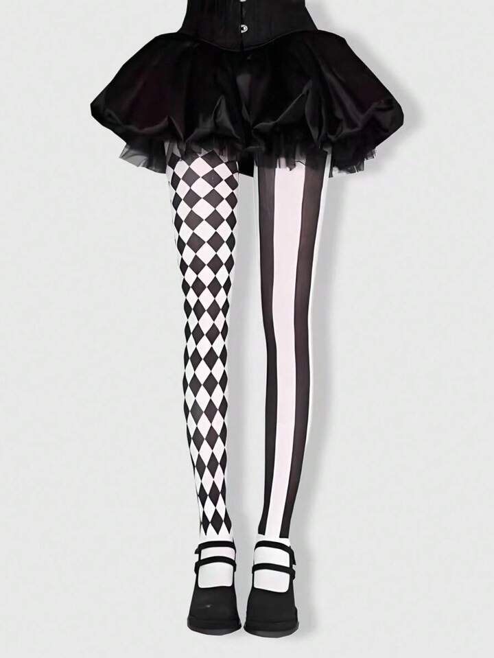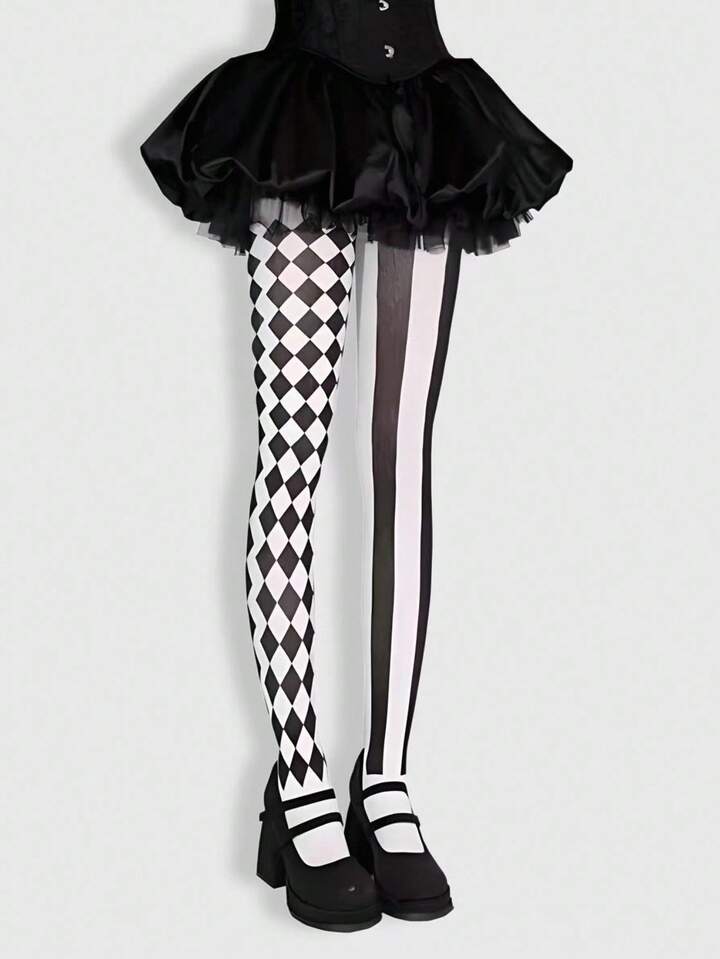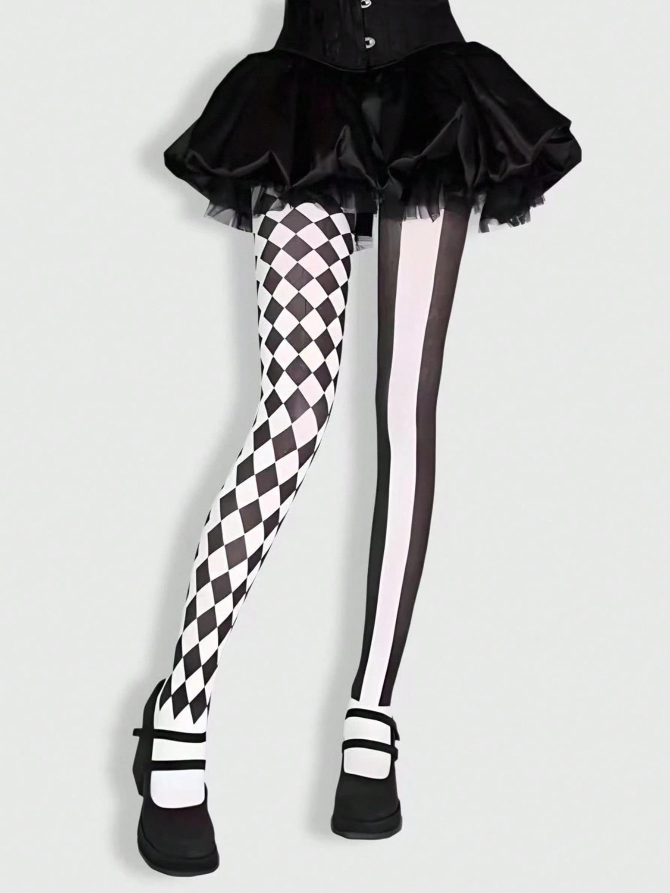 Goth 1 pieza Pantis/Leggings/Medias de mujer asimétricos y sexys de cuadros en blanco y negro con alta elasticidad, adecuados para mujeres de 36 a 59 kg