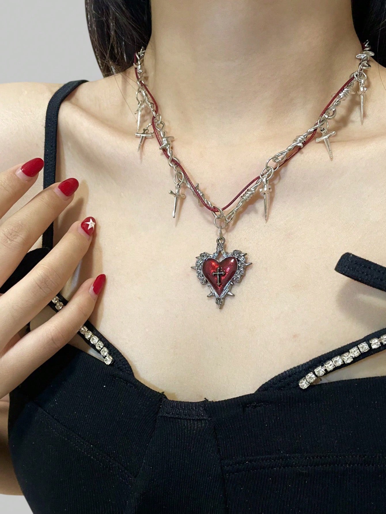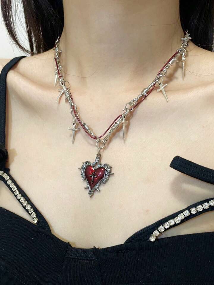 Goth 1 pieza Collar gargantilla de mujer con doble capa con colgante de cruz y corazón, dulce y atrevido