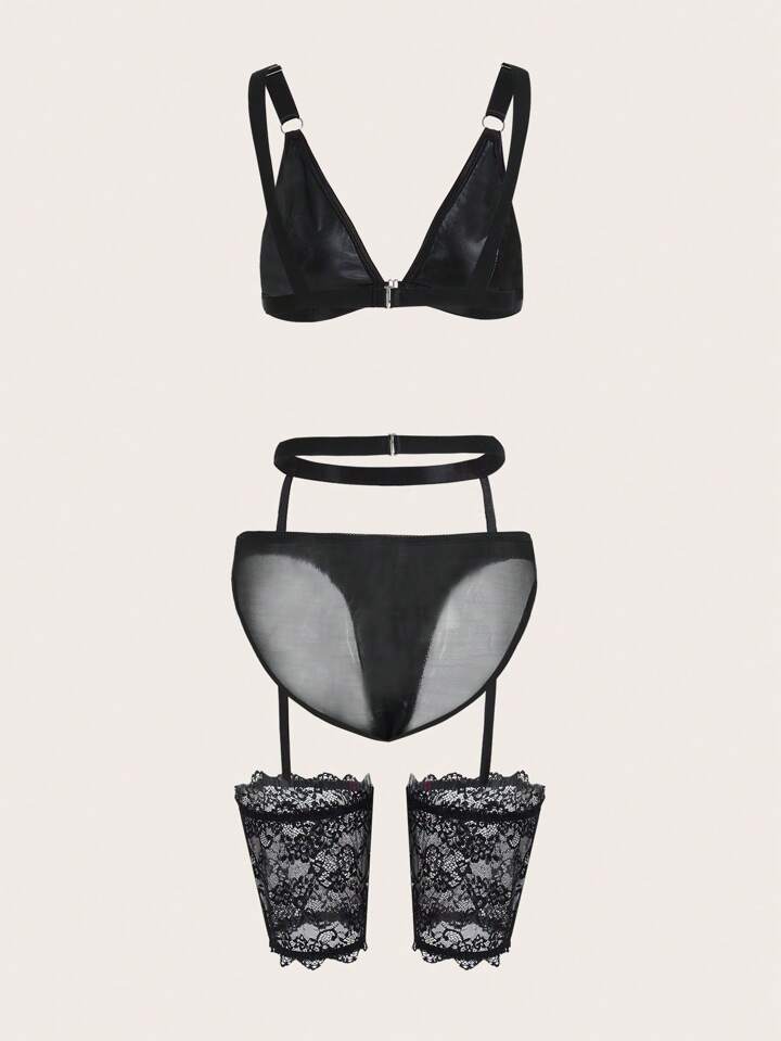Goth 3 piezas Set de lencería con encaje en contraste con liga