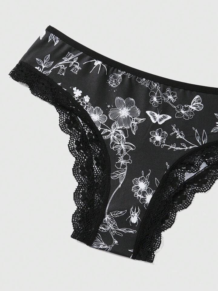 Goth Juego De 3 Piezas Para Mujeres Con Estampado Digital De Mariposa, Calavera Y Flores; Escarpado De Cintura Y Apertura De Pierna Con Encaje