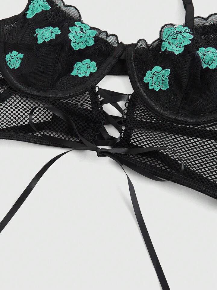 Goth Set de 3 piezas de lencería sexy que incluye sostén con aros, cinturón portaligas y bragas tipo tanga con diseño de rosa