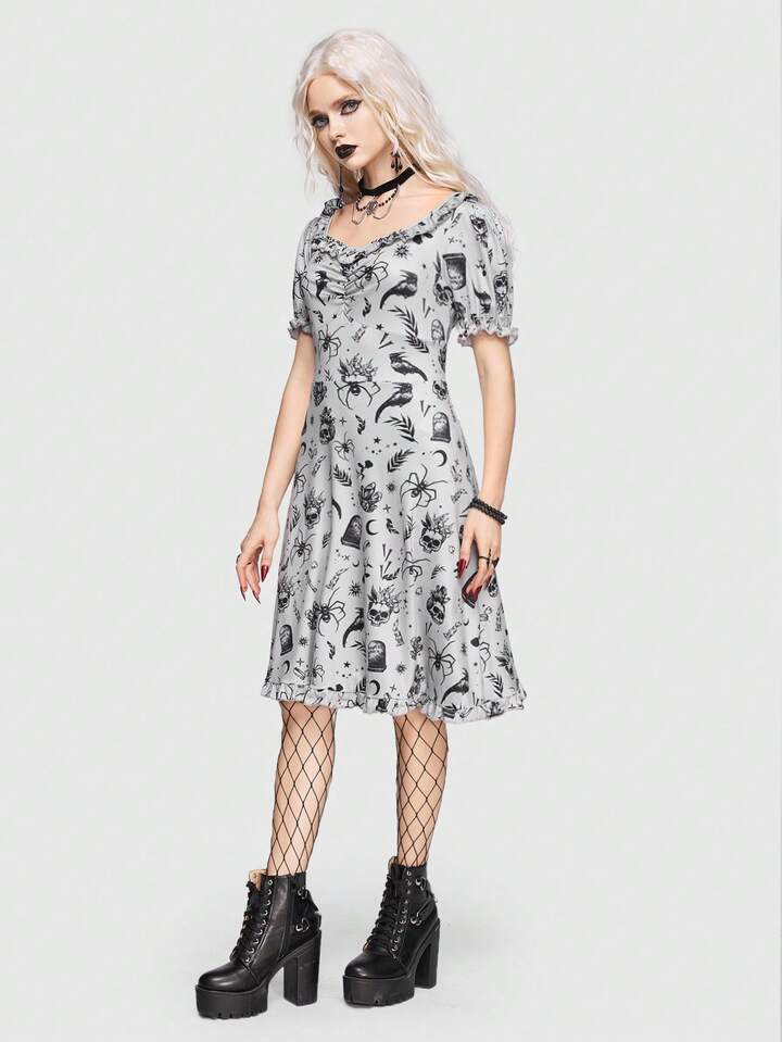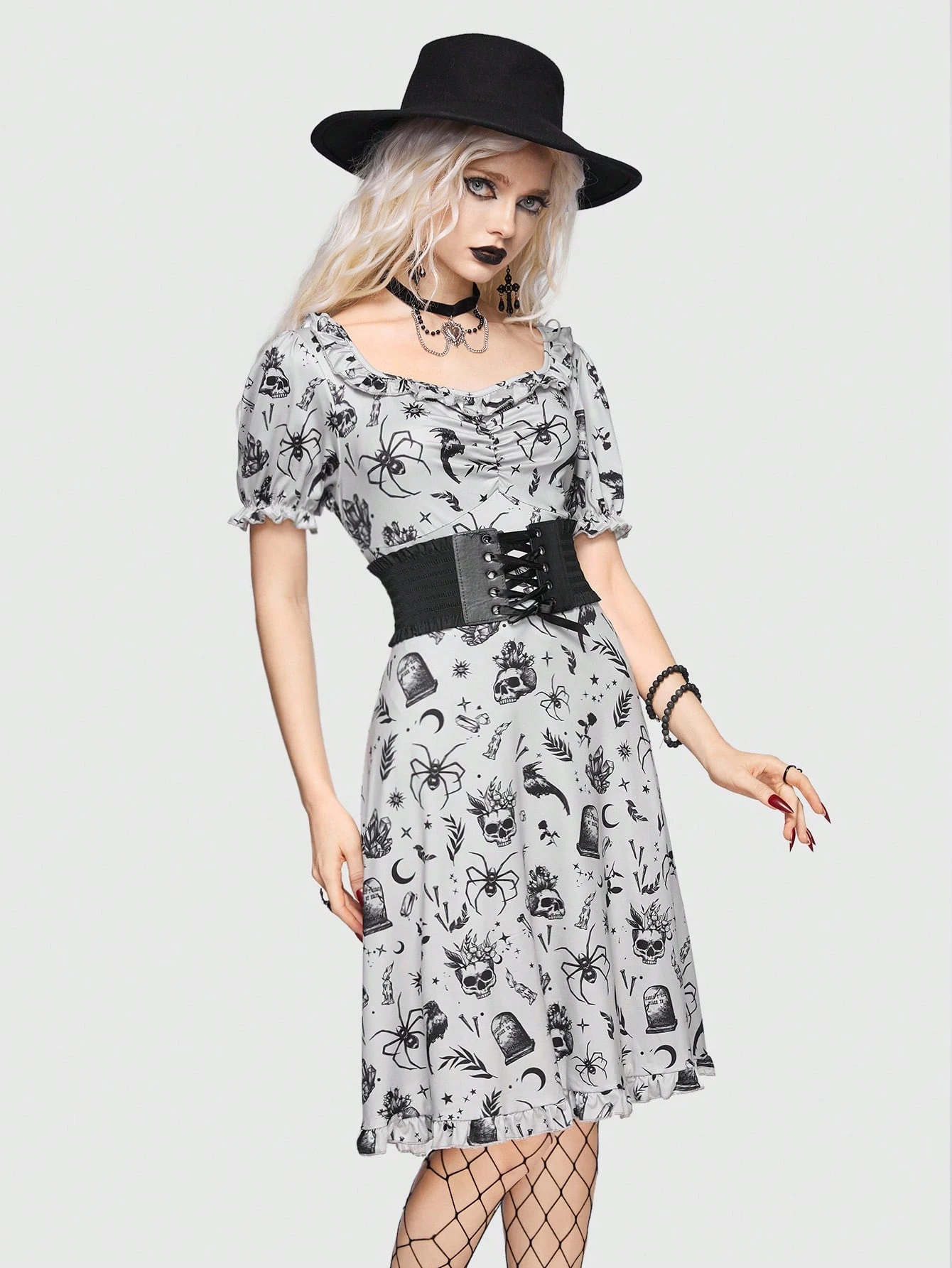 Goth Vestido con estampado ribete fruncido sin cinturón