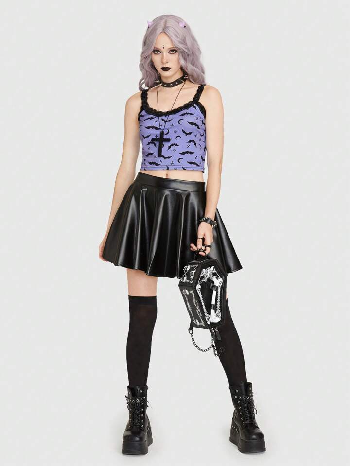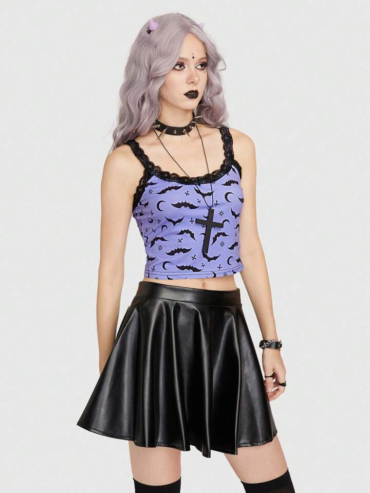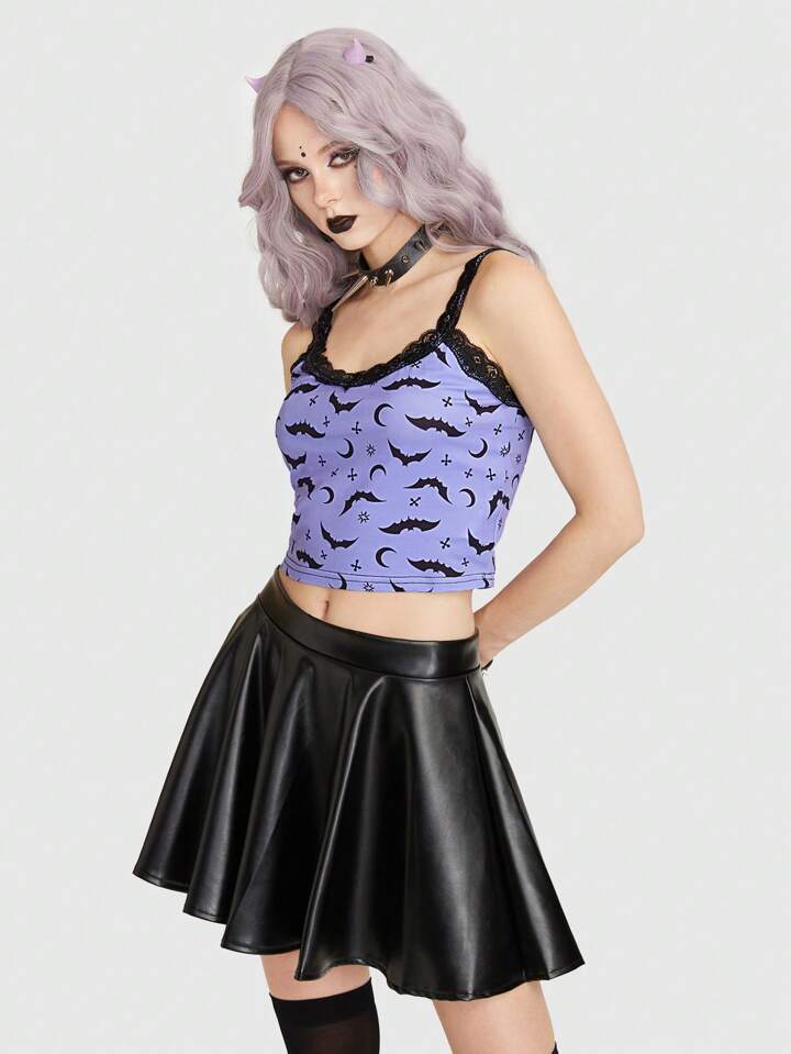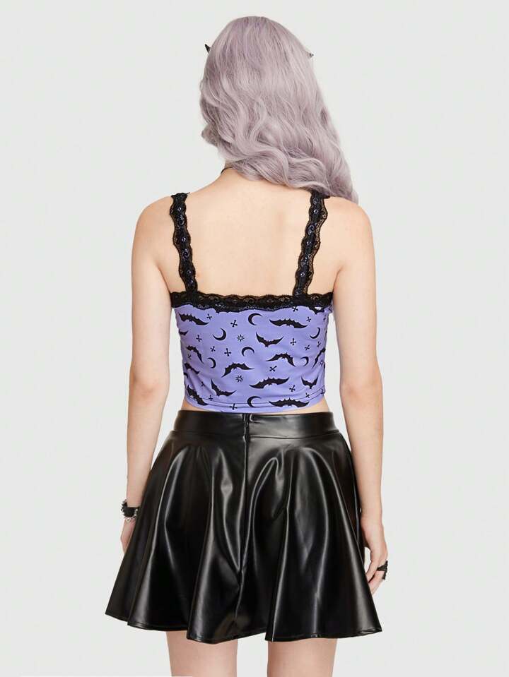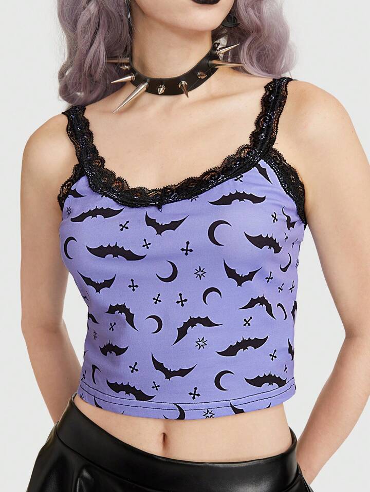 Goth Top de tirantes con estampado de murciélago con encaje en contraste