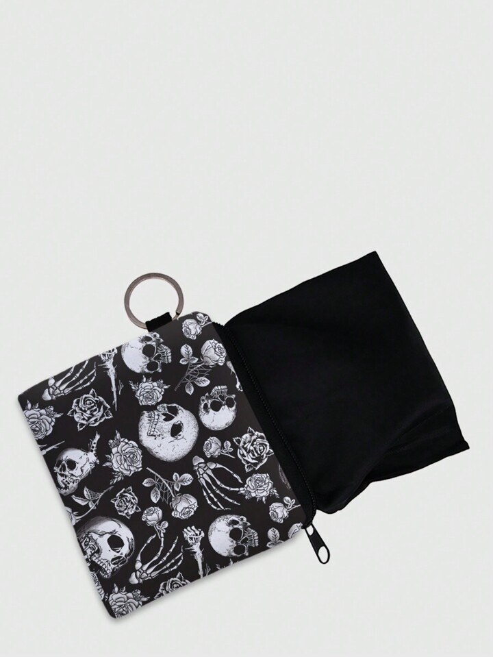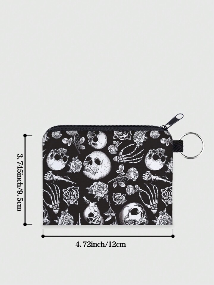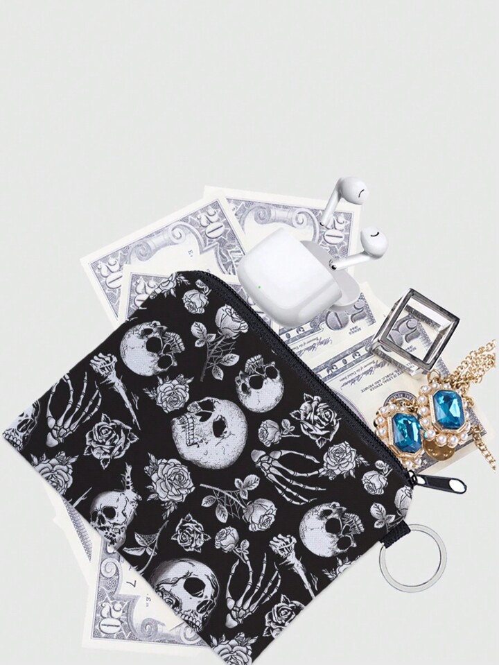 Goth Bolsa Portátil Para Monedas Con Cremallera De Poliéster Con Patrón De Rosa Y Calavera Negra, Pequeña Cartera Para Mujeres, Regalo De Vacaciones