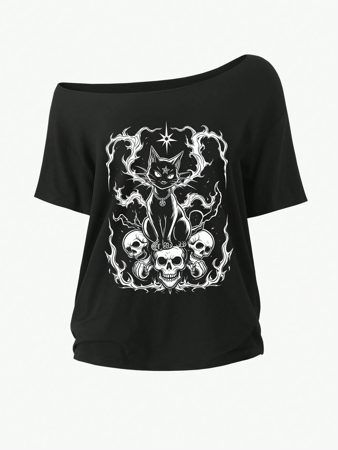 Goth Camiseta asimétrica de cuello casual con estampado de calavera de gato Y2K negro, para uso diario en primavera/verano para mujeres