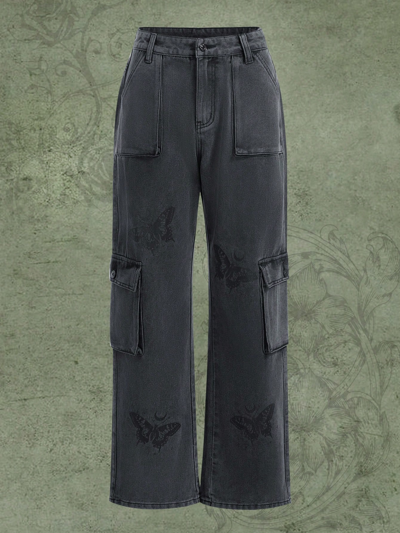 Goth Jeans cargo con estampado de mariposa con bolsillo con solapa