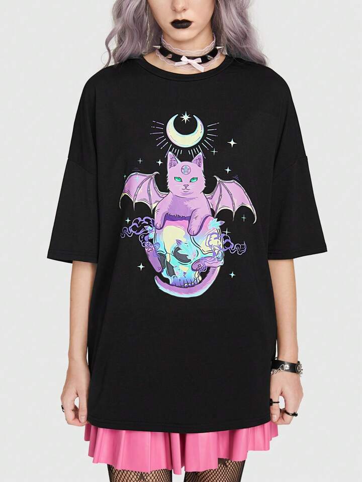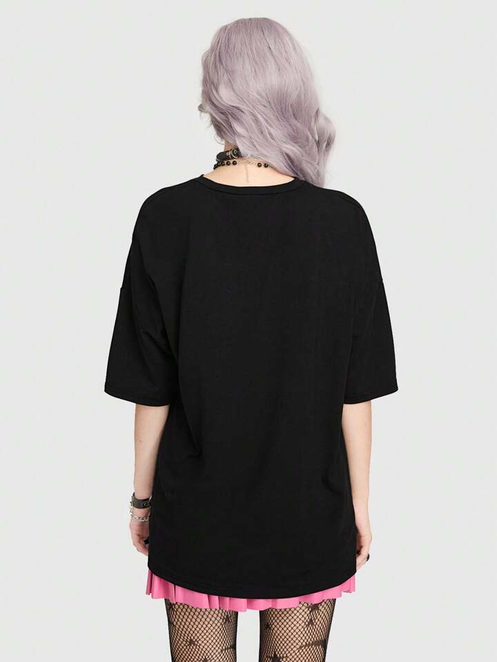 Goth Camiseta de hombro caído con gráfico de dibujos animados, escuela