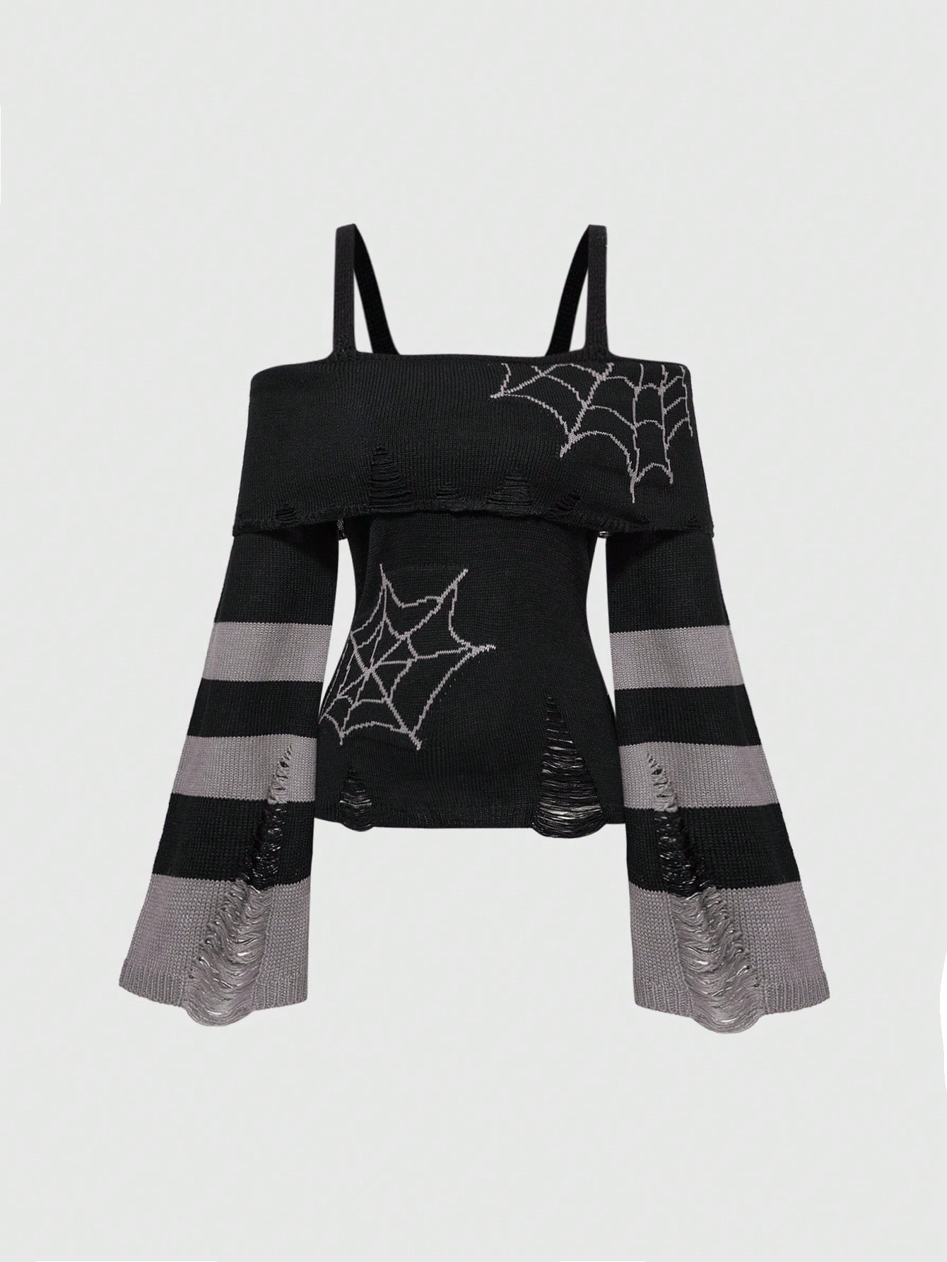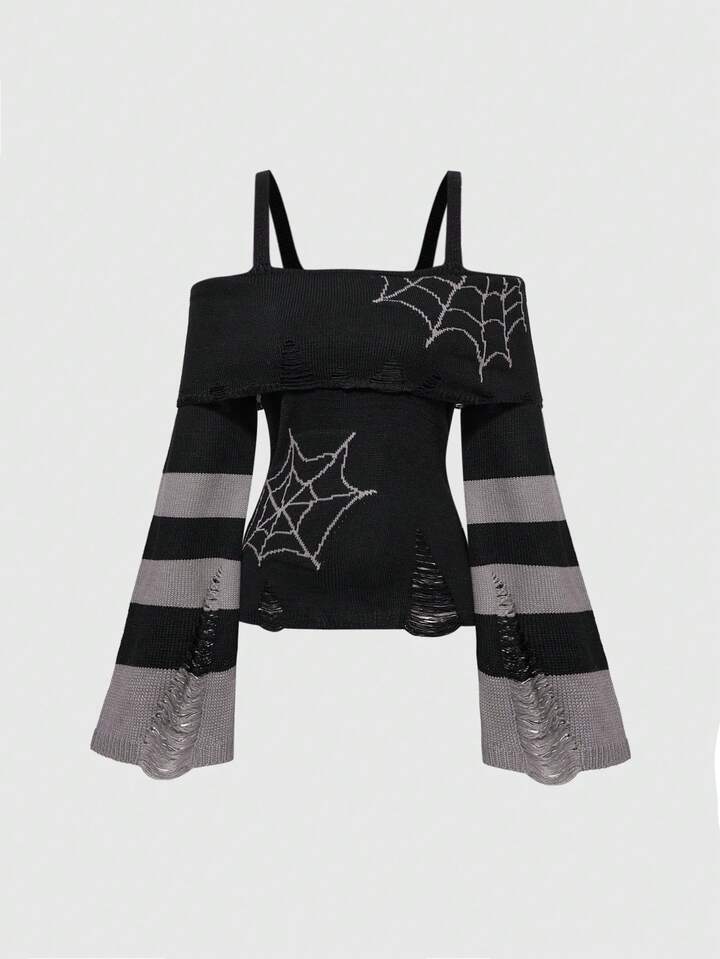 Goth Suéter ajustado para mujer con hombros descubiertos y diseño de telaraña de estilo oscuro y punk de Navidad