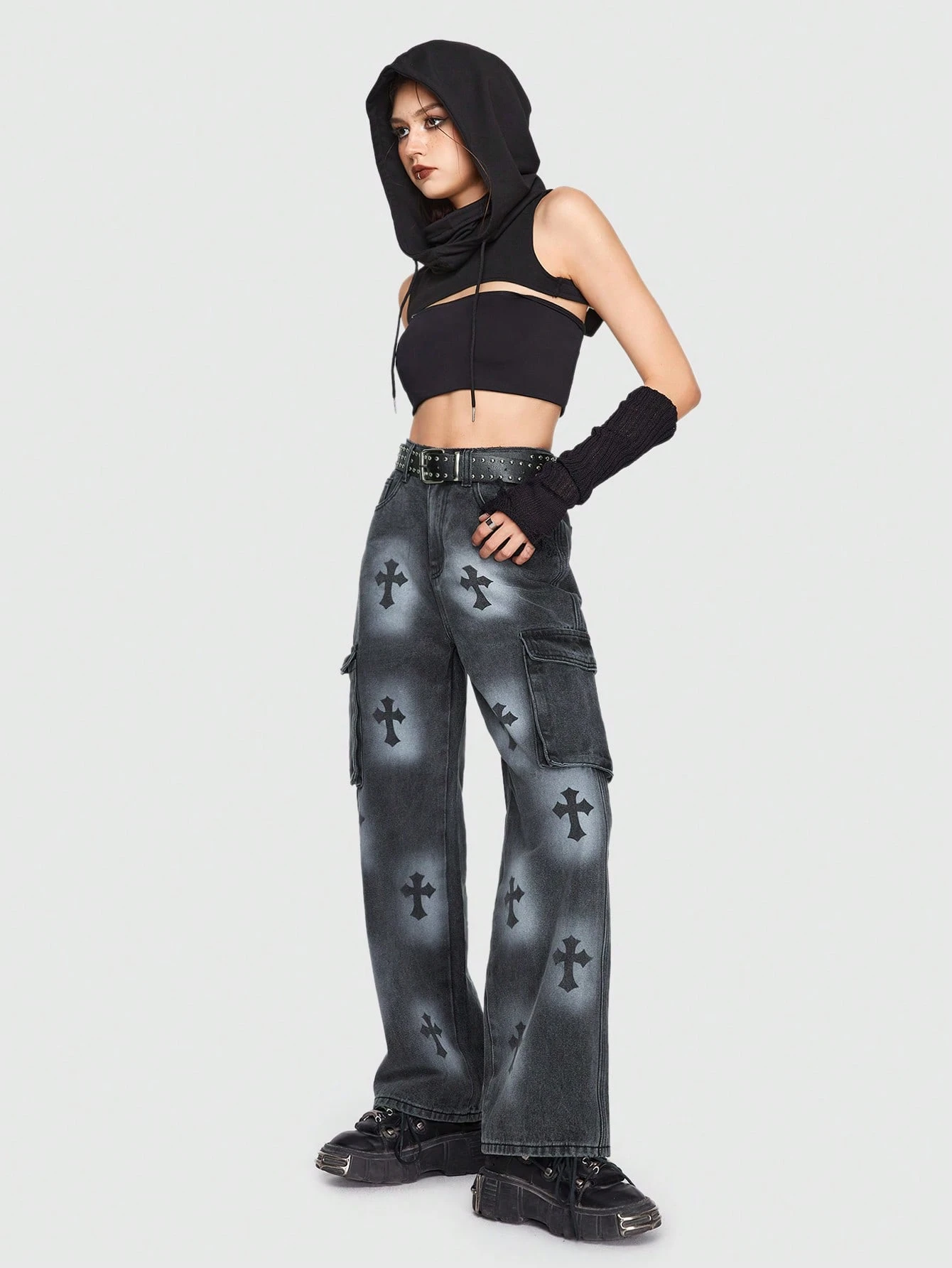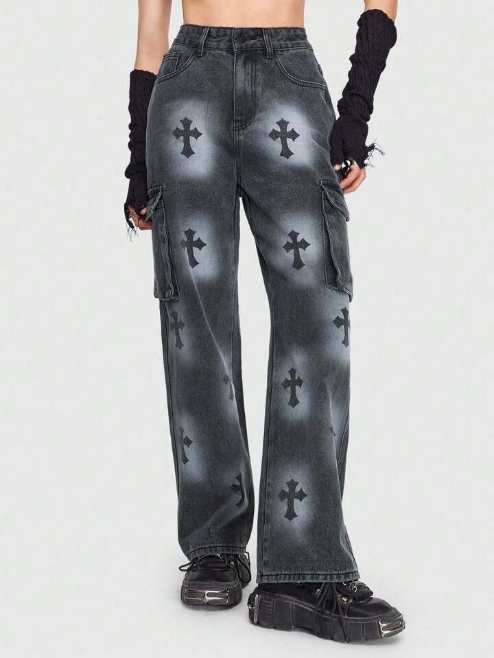 Goth Jeans cargo cruzado con estampado con bolsillo con solapa