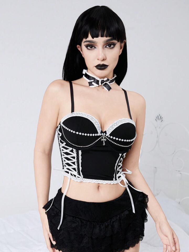 Goth 'Corset' de cadena estética cruzada de acero para chica oscura con lazo de cinta de satén