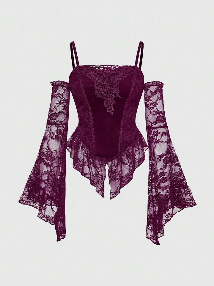 Goth Top de manga acampanada de terciopelo oscuro y encaje de contraste para Halloween