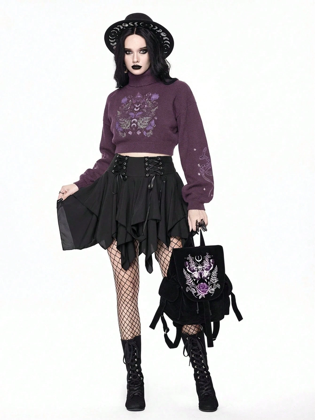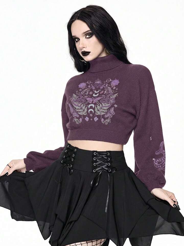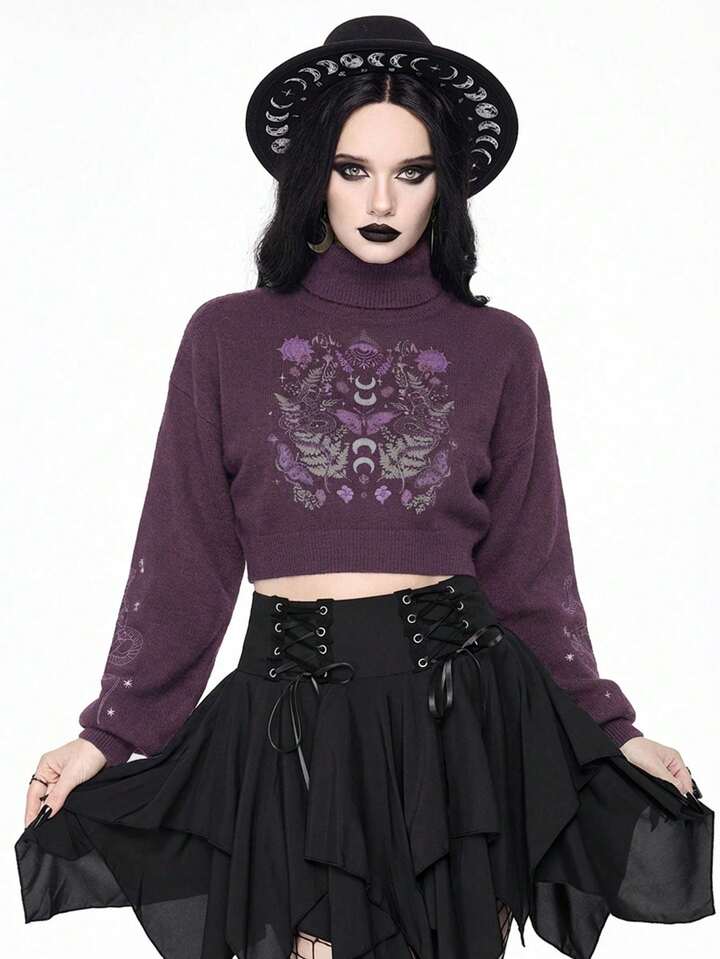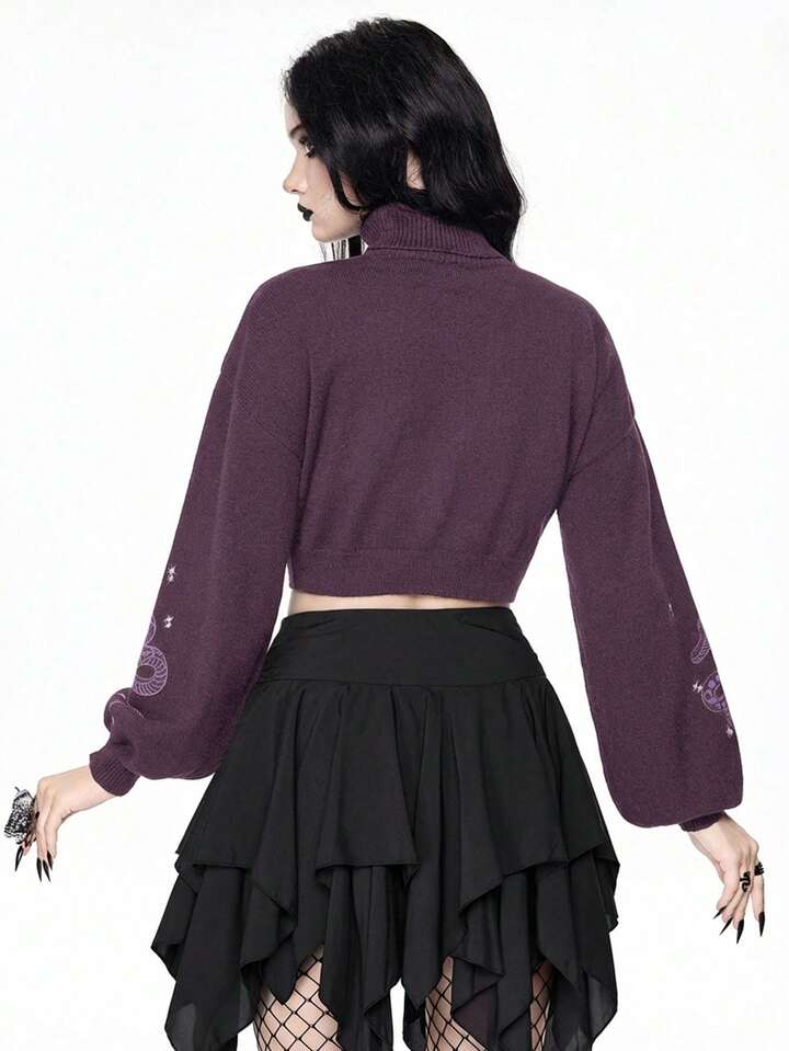 Goth Suéter corto de cuello alto en color oscuro para mujer, blusa de punto con mangas abullonadas y estampado jacquard de piel de serpiente y mariposa vintage, otoño/invierno