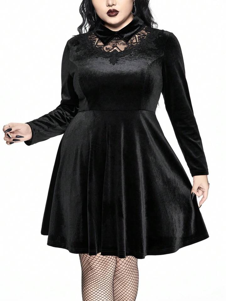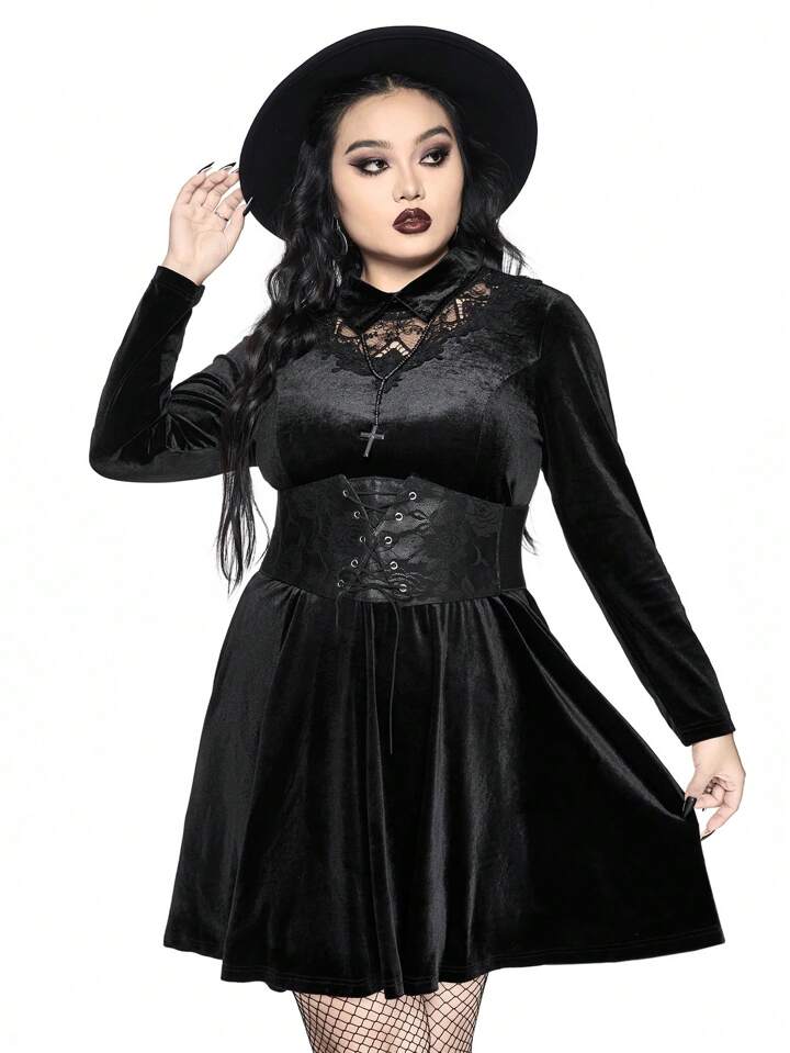 Goth Vestido gótico de línea A con cuello, cintura y aplicaciones de encaje negro para mujeres talla grande
