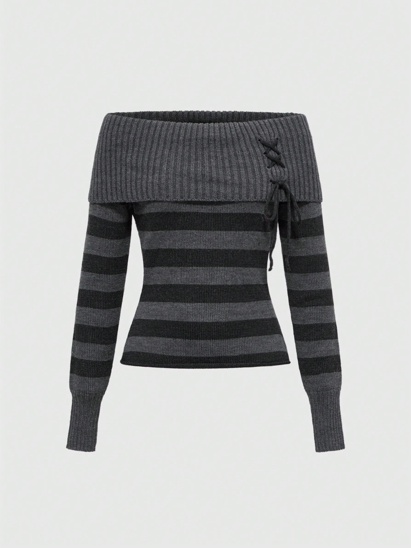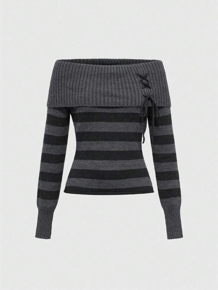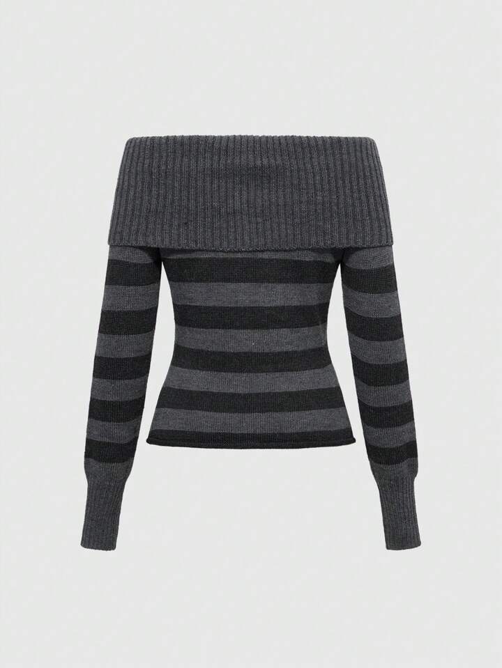 Goth Suéter de mujer a rayas negras y grises con diseño de tirantes de cuello caído y mangas acampanadas, estilo punk oscuro