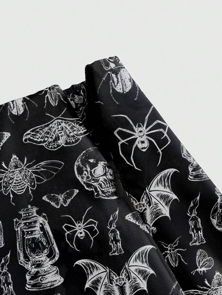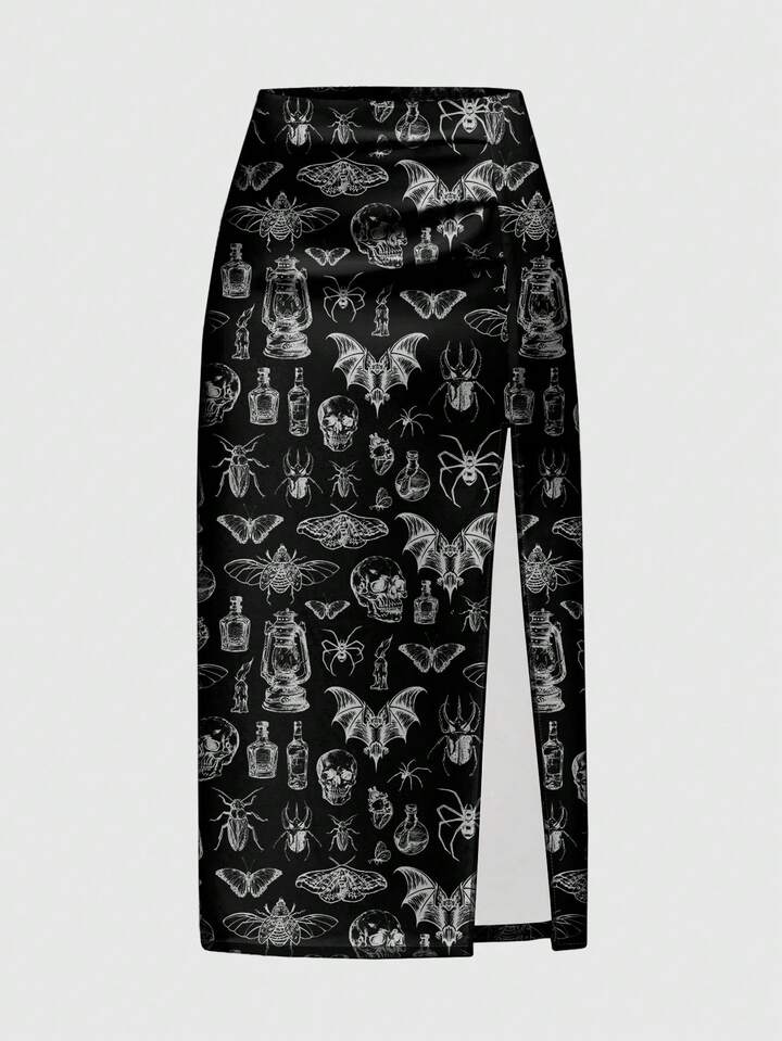 Goth Falda larga de mujer con abertura sexy, con estampado oscuro de bosque de horror con calavera, polilla, araña y murciélago de la Academia Cuervo Oscuro, para Halloween