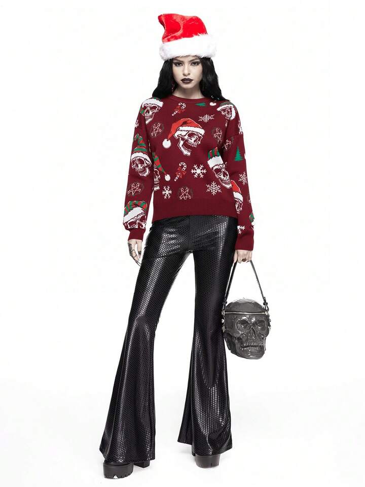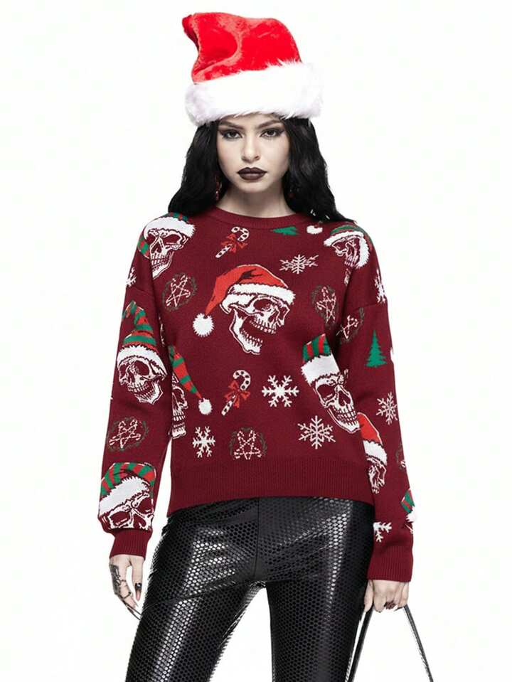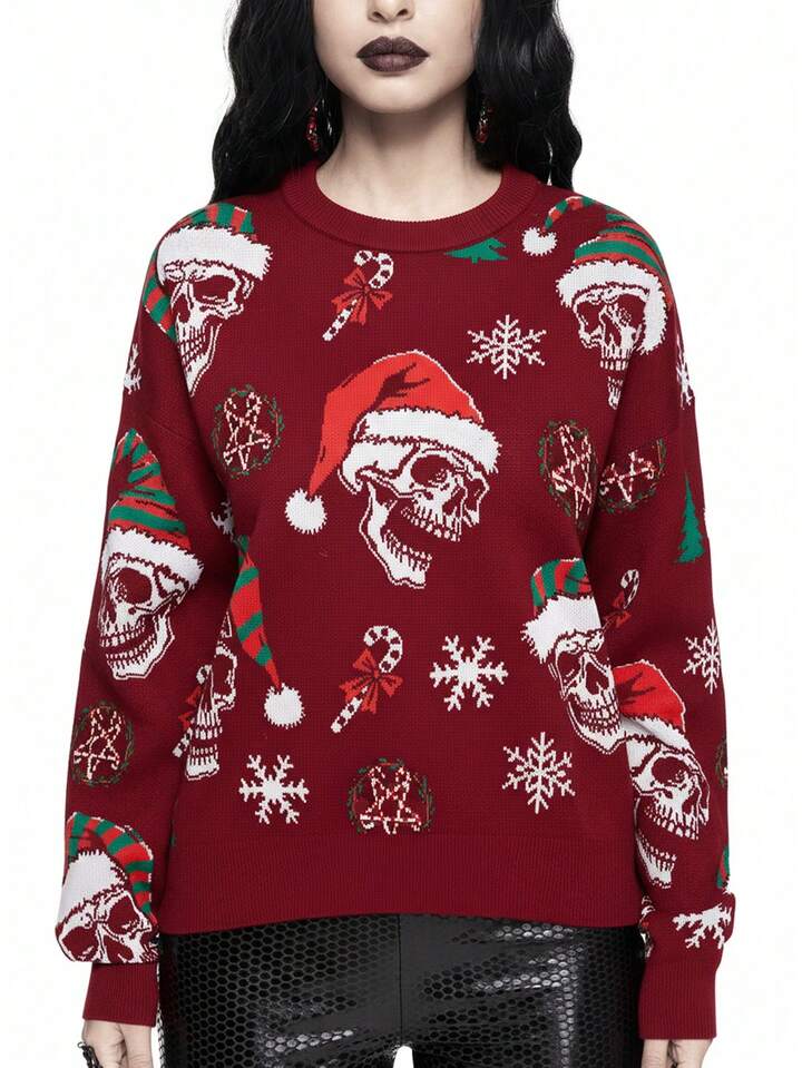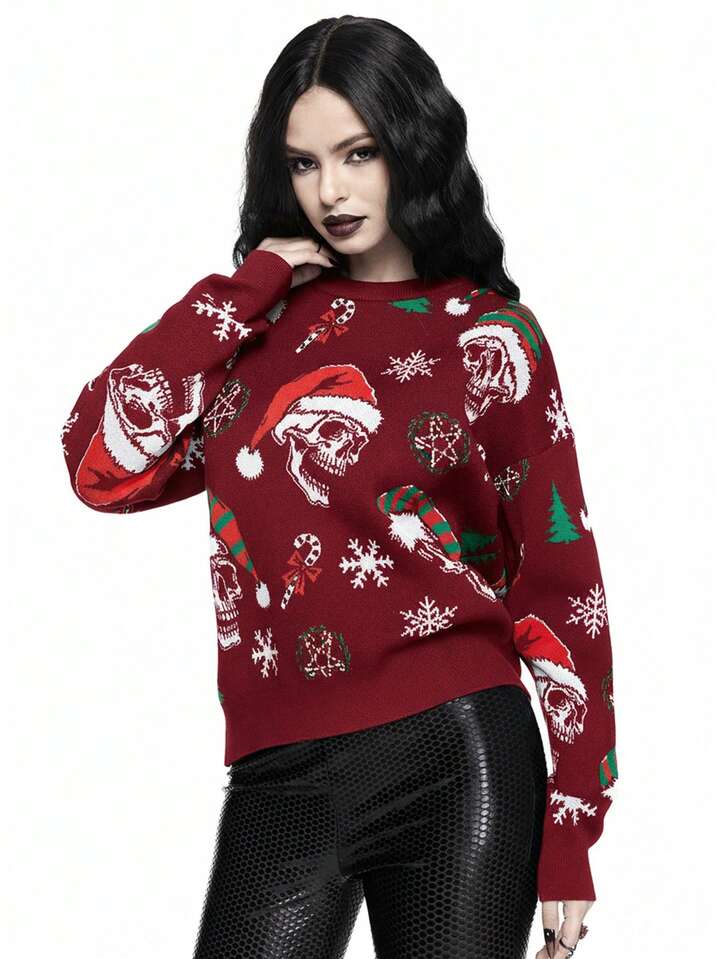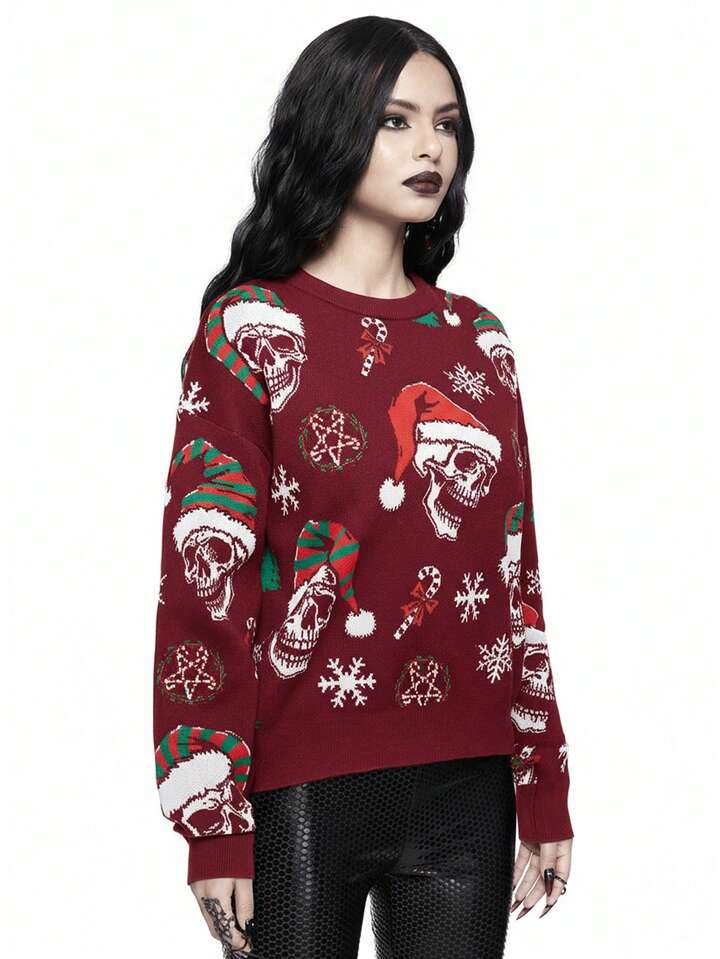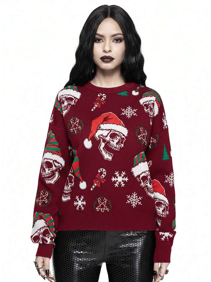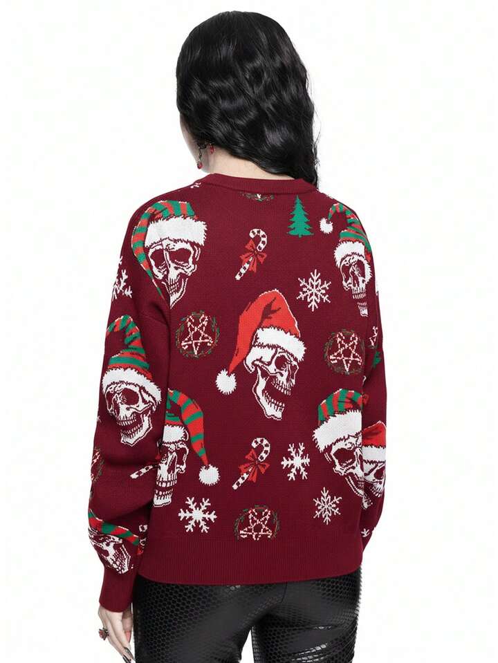 Goth Suéter con estampado de calavera oscura y corona de Navidad