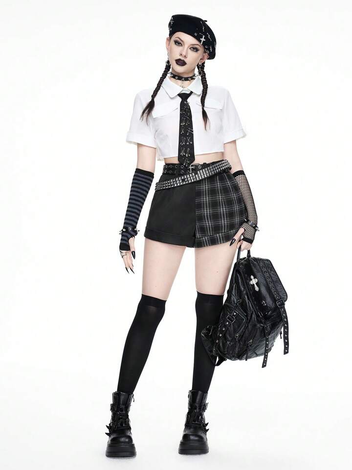 Goth Pantalones cortos de mujer con estampado de cuadros vintage oscuro y parches con diseño Yin-Yang