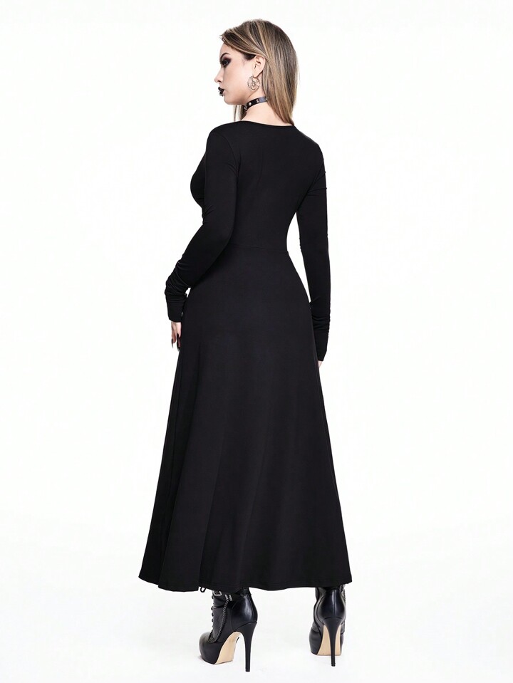 Goth Vestido de señora sexy con cuello en V profundo, raja alta y botones de piel sintética (PU)